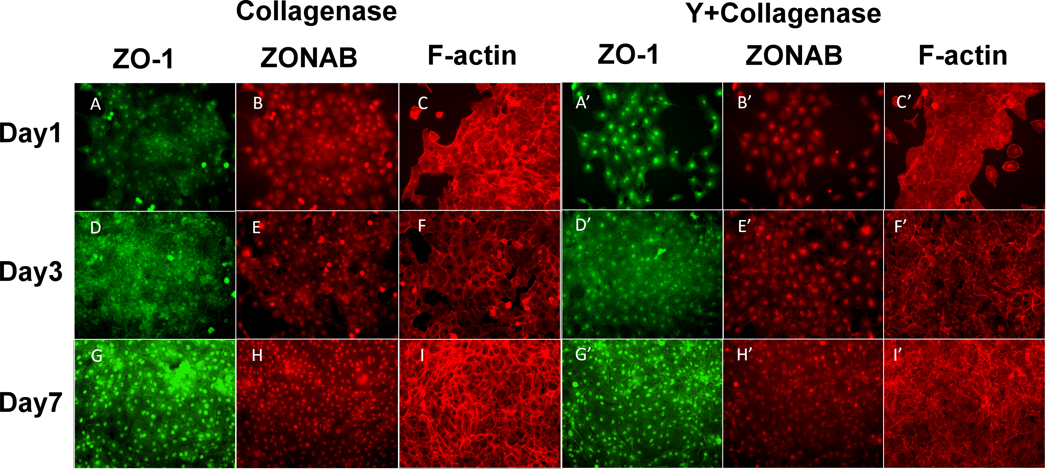 Figure 3. ZO-1, ZONAB, and F-actin expression in collagenase A-prepared BCECs with or without Y-27632 on days 1, 3 (subconfluence),