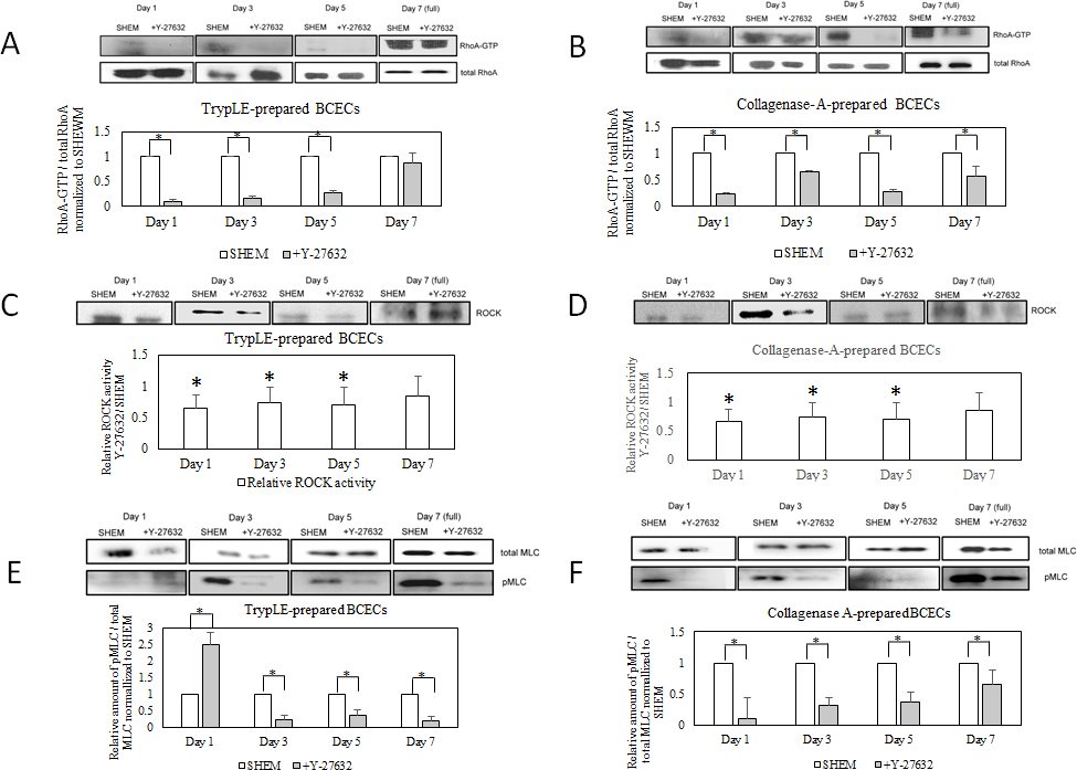 effects at confluence on day 7 (C). In the collagenase-A-prepared BCECs, the Y-27632 treatment inhibited ROCK activity on days 1, 3, 5, and 7 (confluence status;