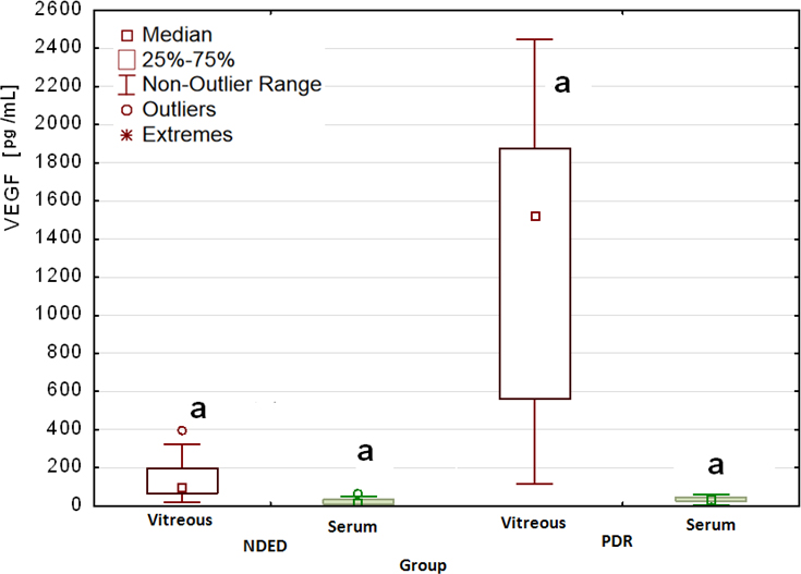Relationships of vitreous and serum VEGF values in non-diabetic patients with eye disorders (NDED) and proliferative diabetic retinopathy (PDR) patients. NDED group (n=50); PDR group (n=37).