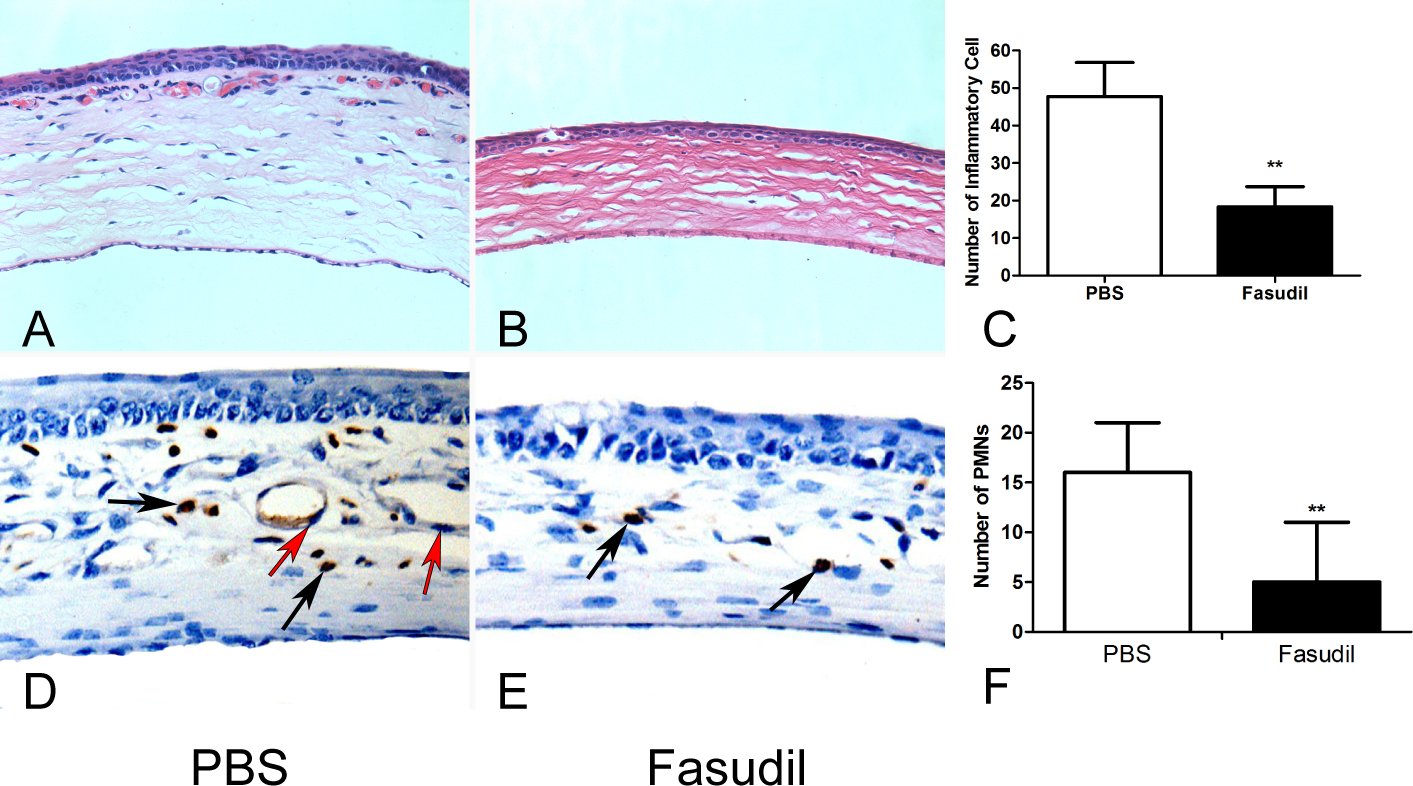 (PMNs), macrophages, and lymphocytes in the corneal stroma per field was lower with 100 μM fasudil treatment than with phosphate-buffered