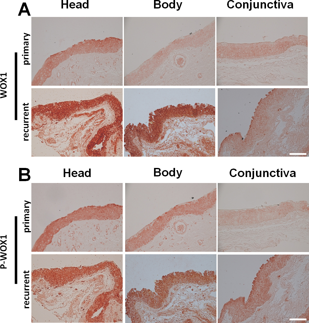 primary and recurrent pterygium and the conjunctiva (n=8/group). A: WOX1 and B: p-WOX1 are highly expressed in the epithelial cells of the pterygium head, whereas they were less expressed in the body