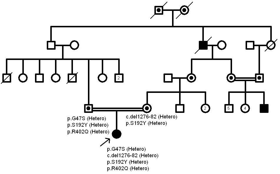 The pedigree of patient 15. Both p.S192Y and p.R402Q together with the p.G47S are not pathogenic in the patient’s father according to the above pedigree.