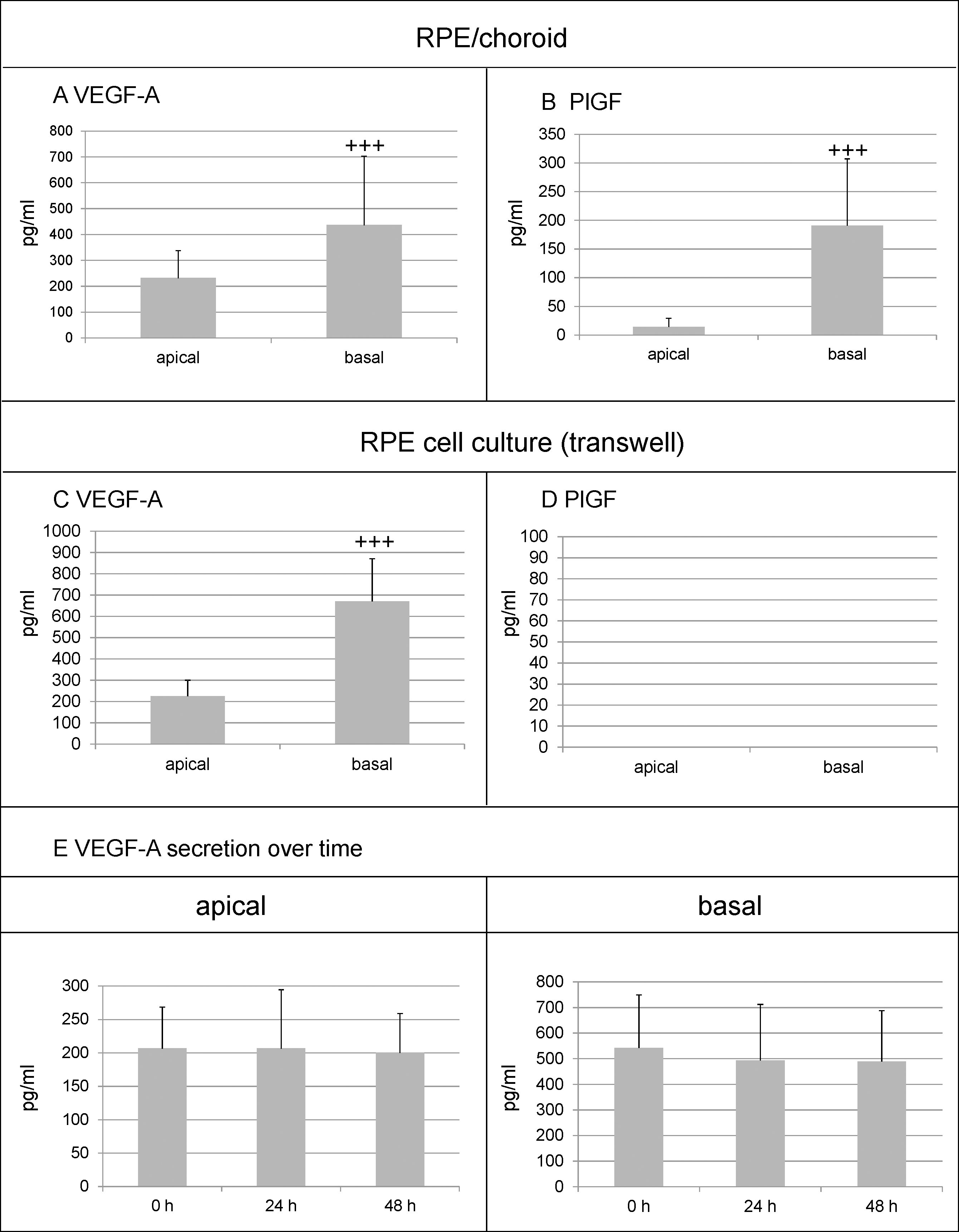 stronger secretion on the basal side. C: In the RPE cell culture, VEGF is basally and apically secreted, with a stronger secretion on the basal side. D: In RPE cell culture, no PlGF was found. E: The secretion of VEGF in the RPE cell culture is stable over time. Supernatants were collected for 24 h and were analyzed
