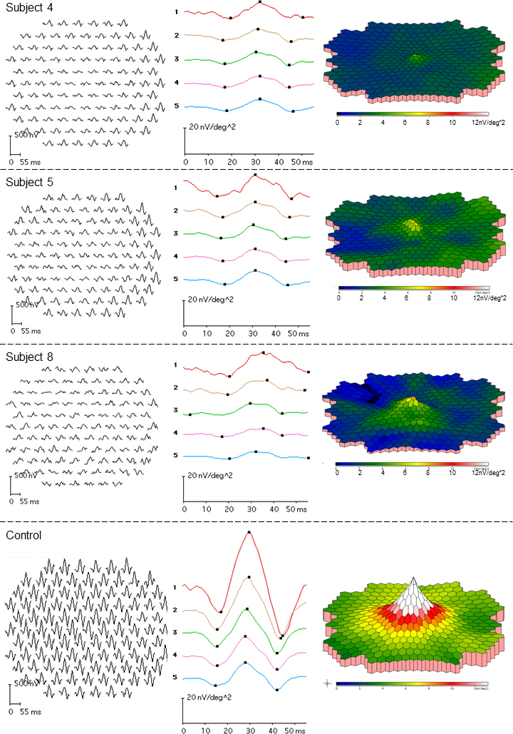changes. Subject 5 also has reduced mERG amplitudes and delayed ITs. In this subject, the mERG alterations are accompanied