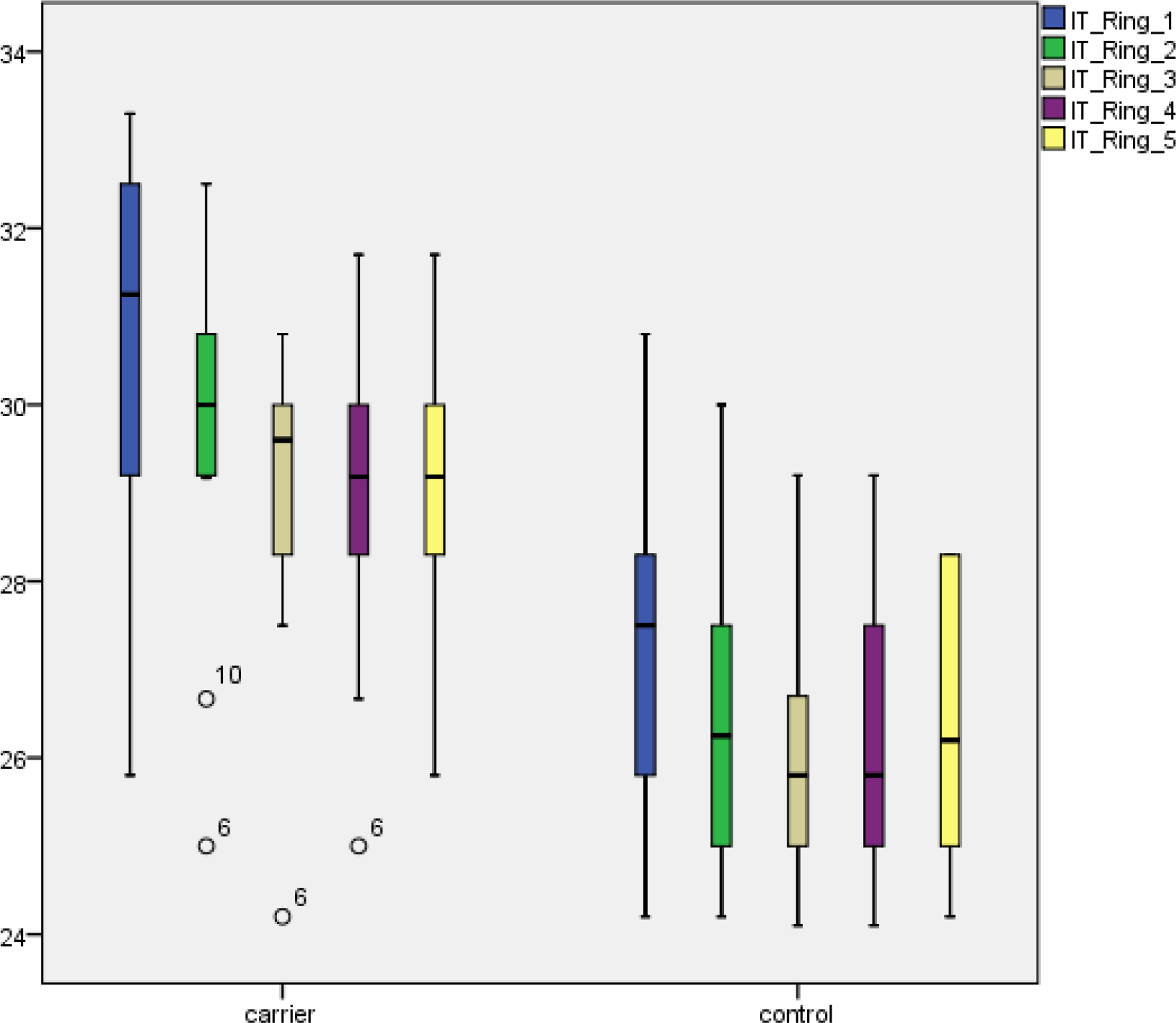 carriers and controls. Each box shows the median and interquartile ranges. Bars illustrate range. Circles indicate outliers.
