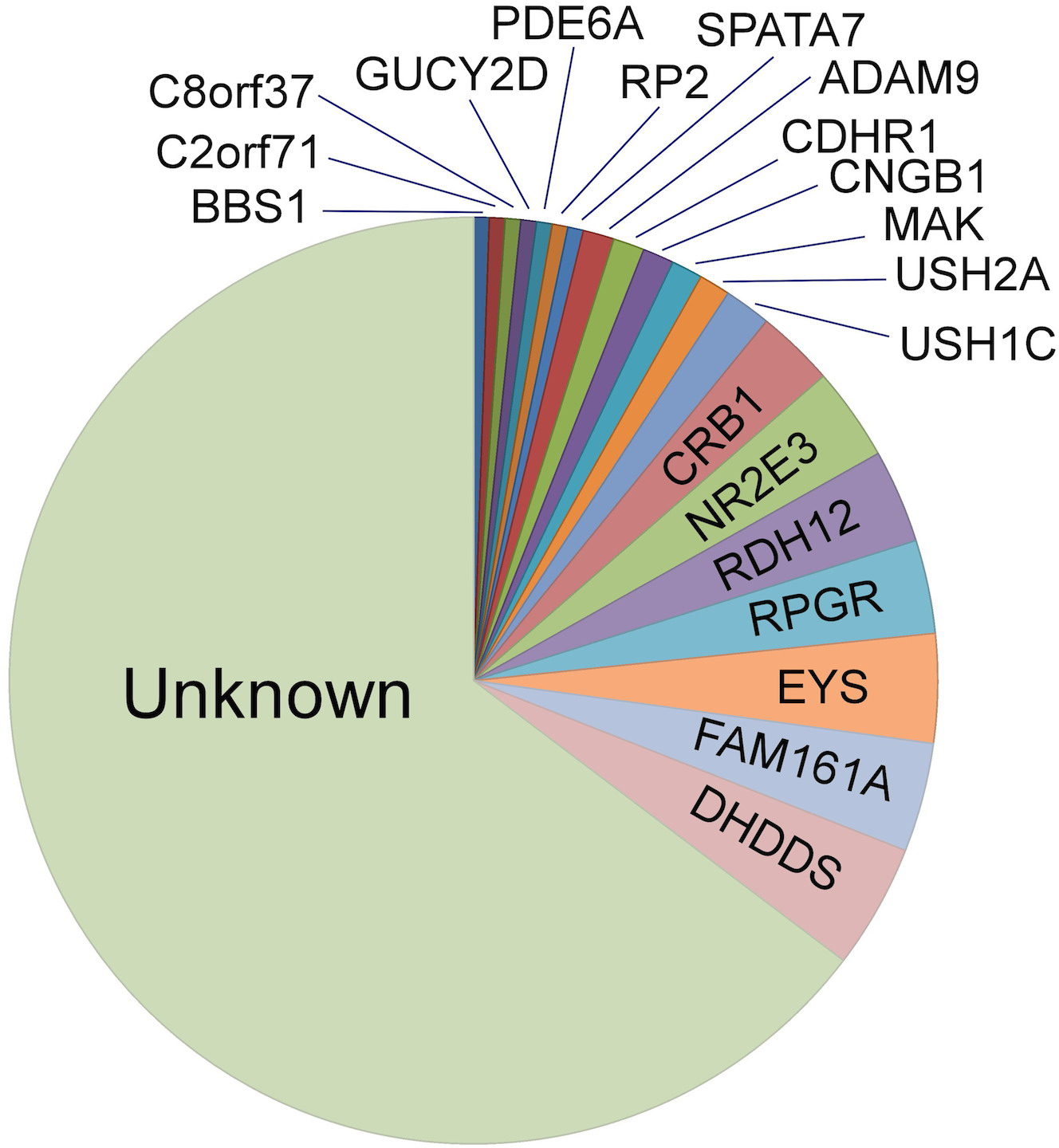 Pie chart showing the distribution of disease-causing genes in the vicinity of Jerusalem. Please note that most families (65%) have not been genetically diagnosed (“Unknown”).