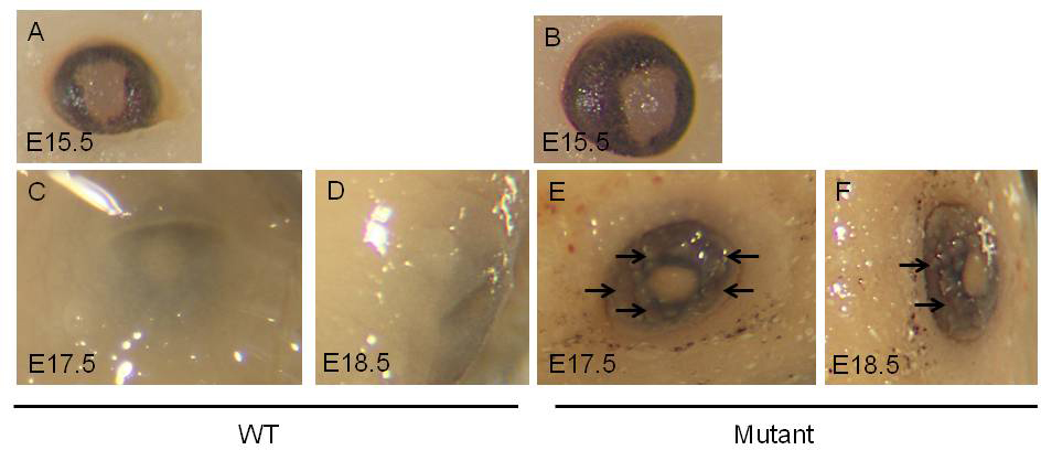 15.5, the cornea is not covered by eyelids in the wild-type (WT) (A) and mutant embryos (B). At E17.5 and E18.5, the upper and lower eyelids are fused to each other, covering the cornea, in the WT eye (C, D), while no eyelid structure is observed in the mutant embryo (E, F).