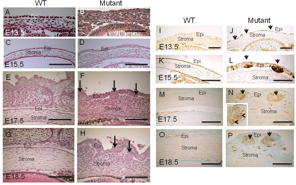 was observed (D). At E17.5 and E18.5, focal epithelial cell nodules (arrows) are observed in the corneal epithelium in the mutant embryo