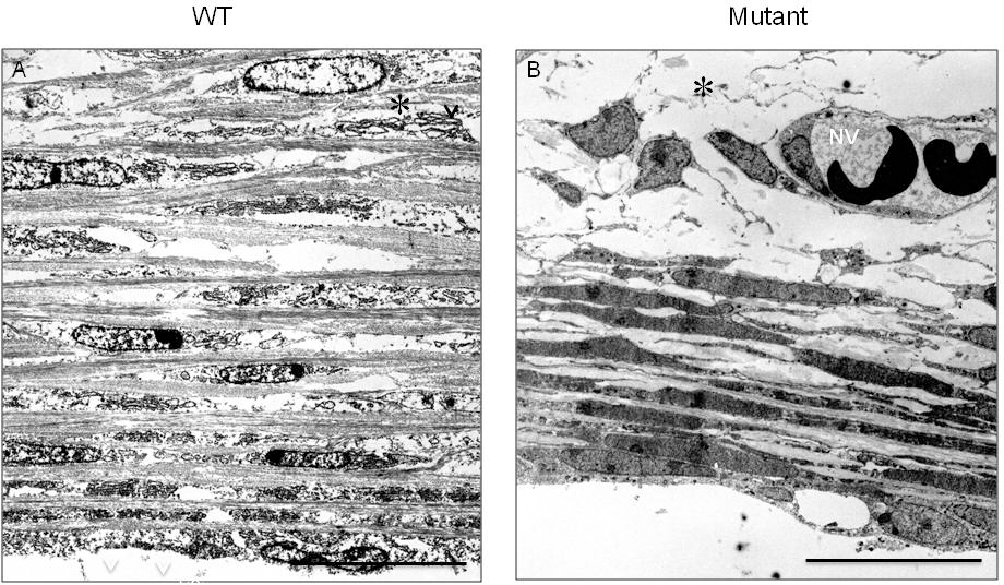 of the wild-type (WT) embryo cornea. B: This lamellar structure is not observed in the anterior stroma of the mutant cornea (asterisk). Neovascularization (NV)