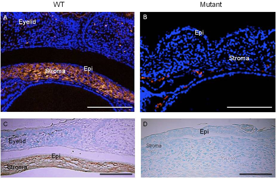 is labeled for keratocan (A), while keratocan is not detected in the mutant corneal stroma (B). The entire corneal stroma of the WT embryo is positive for collagen type I (C). The mutant stroma lacks collagen I (D). Epi, corneal epithelium; Bar, 100 μm.