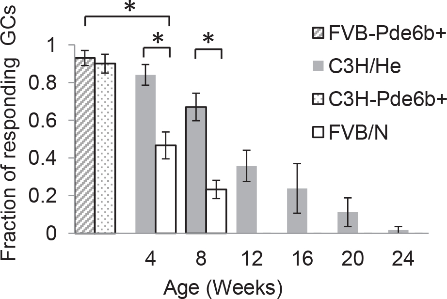C3H/He-Pde6b+ and FVB/N-Pde6b+ lines. At 4 weeks, the fraction of responding GCs in the C3H/HeOu mice approximated that of Pde6b+ mice, while the number of responding cells in the age-matched FVB/N mice was already significantly reduced. No responding