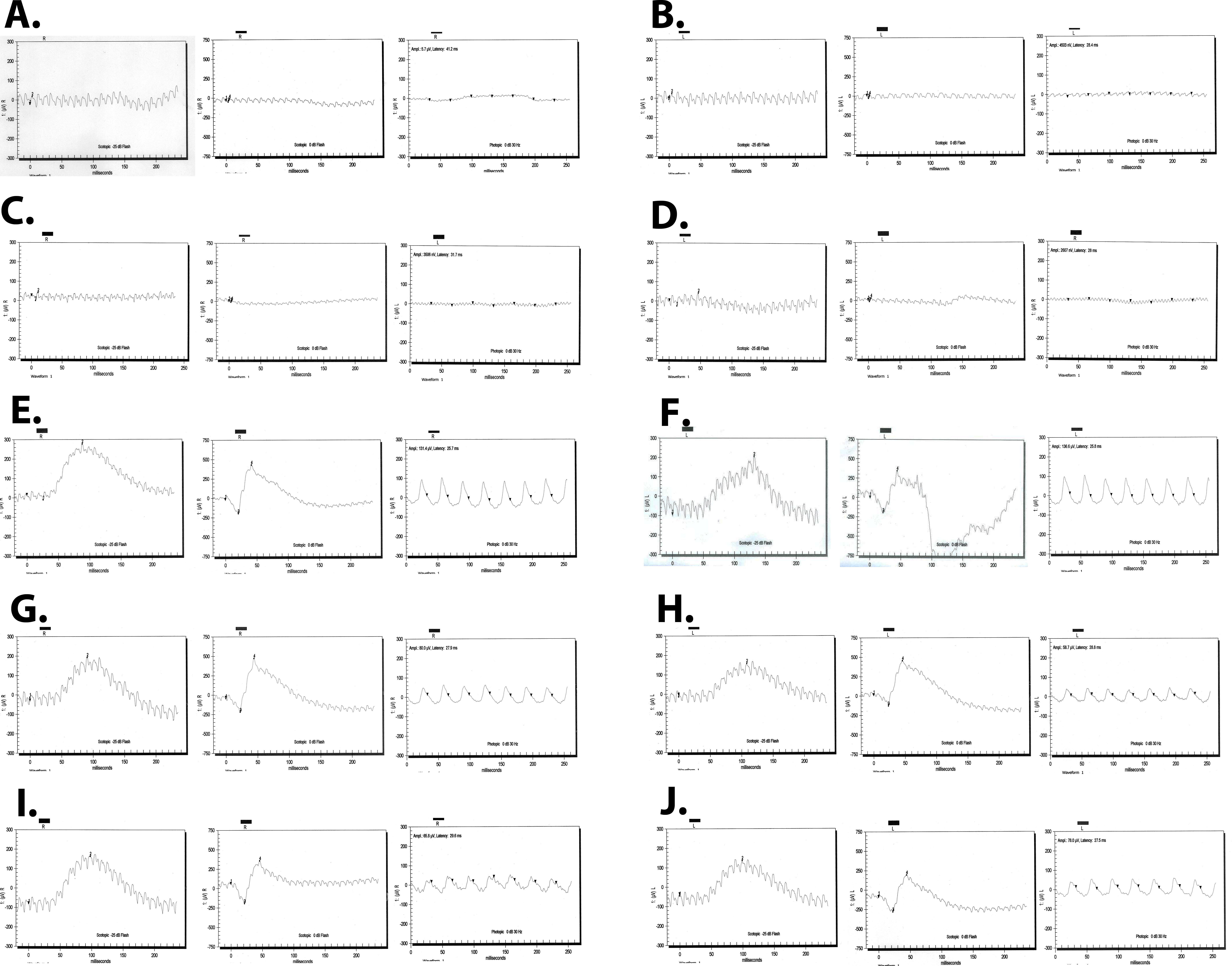 response of A) OD and B) OS of individual 21; C) OD and D) OS of individual 30; E) OD and F) OS of individual 33 (examined at the age of 22 years); G) OD and H) OS of individual 33 (examined at the age of 24 years); I) OD and J) OS of unaffected individual 41. Affected individuals 21 and 30 manifest typical retinitis pigmentosa (RP) changes on electroretinography