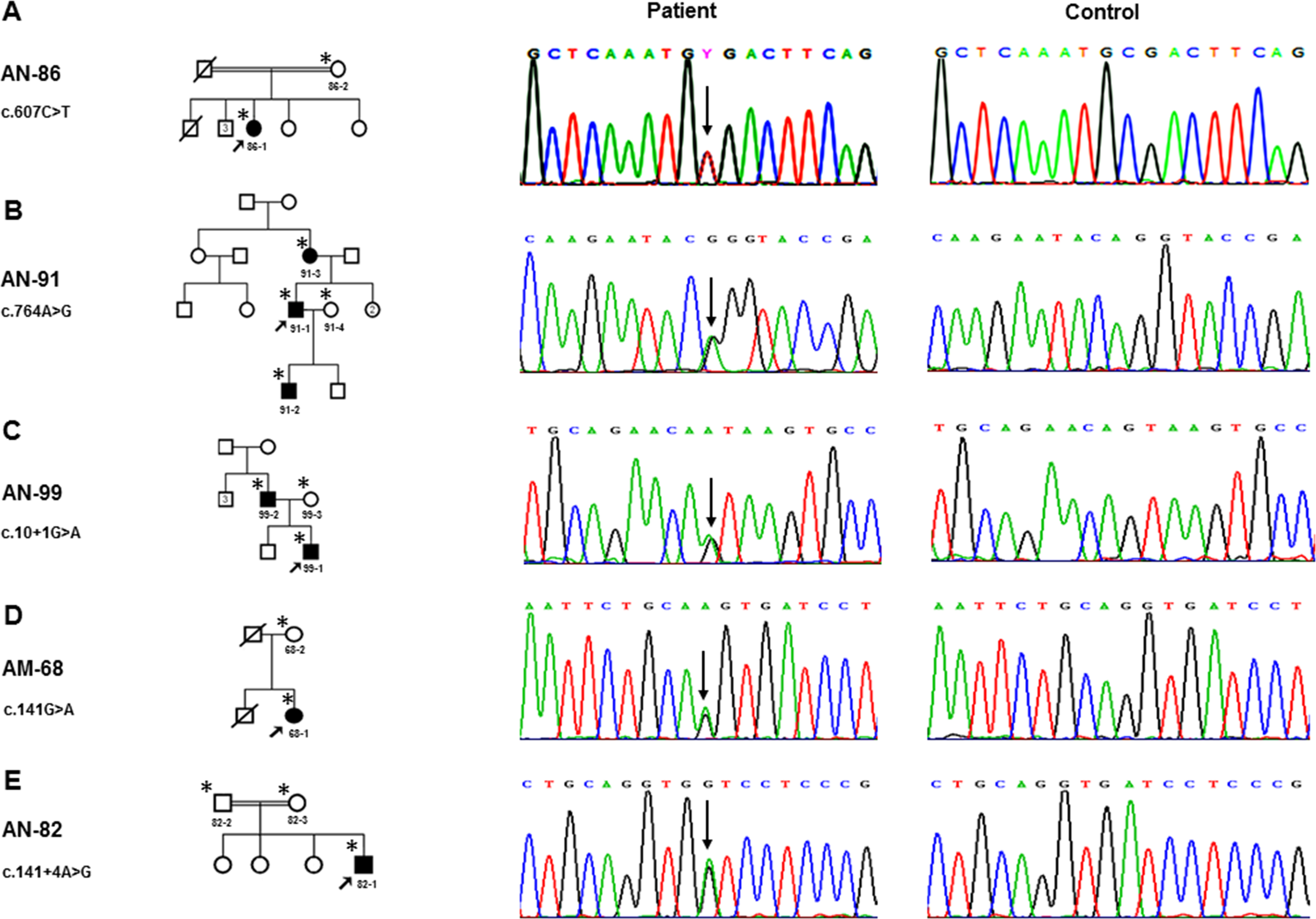 Figure 3. Single base substitution mutations detected in PAX6. One known (c.607C>T) and four novel (c.764A>G, c.10+1G>A, c.141G>A, and c.141+4A>G) point mutations were found in five unrelated