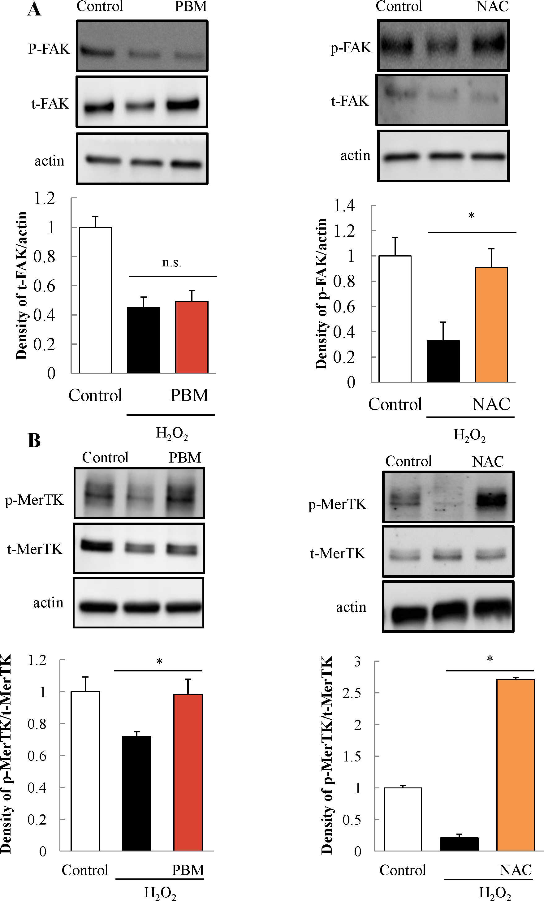 FAK. NAC increased the expression of phosphorylated FAK. B: Oxidative stress also reduced the expression of phosphorylated MerTK, and both photobiomodulation and NAC increased the