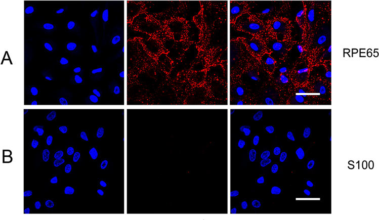 Figure 1. Phenotype identification of the cultured human RPE cells using immunofluorescence (representative image; n = 5). A: All of the cultured cells were positively stained with the RPE65 antibody. B: All of the cultured cells were negatively stained with the S100 antibody. Nuclei were stained by 4',6-diamidino-2-phenylindole