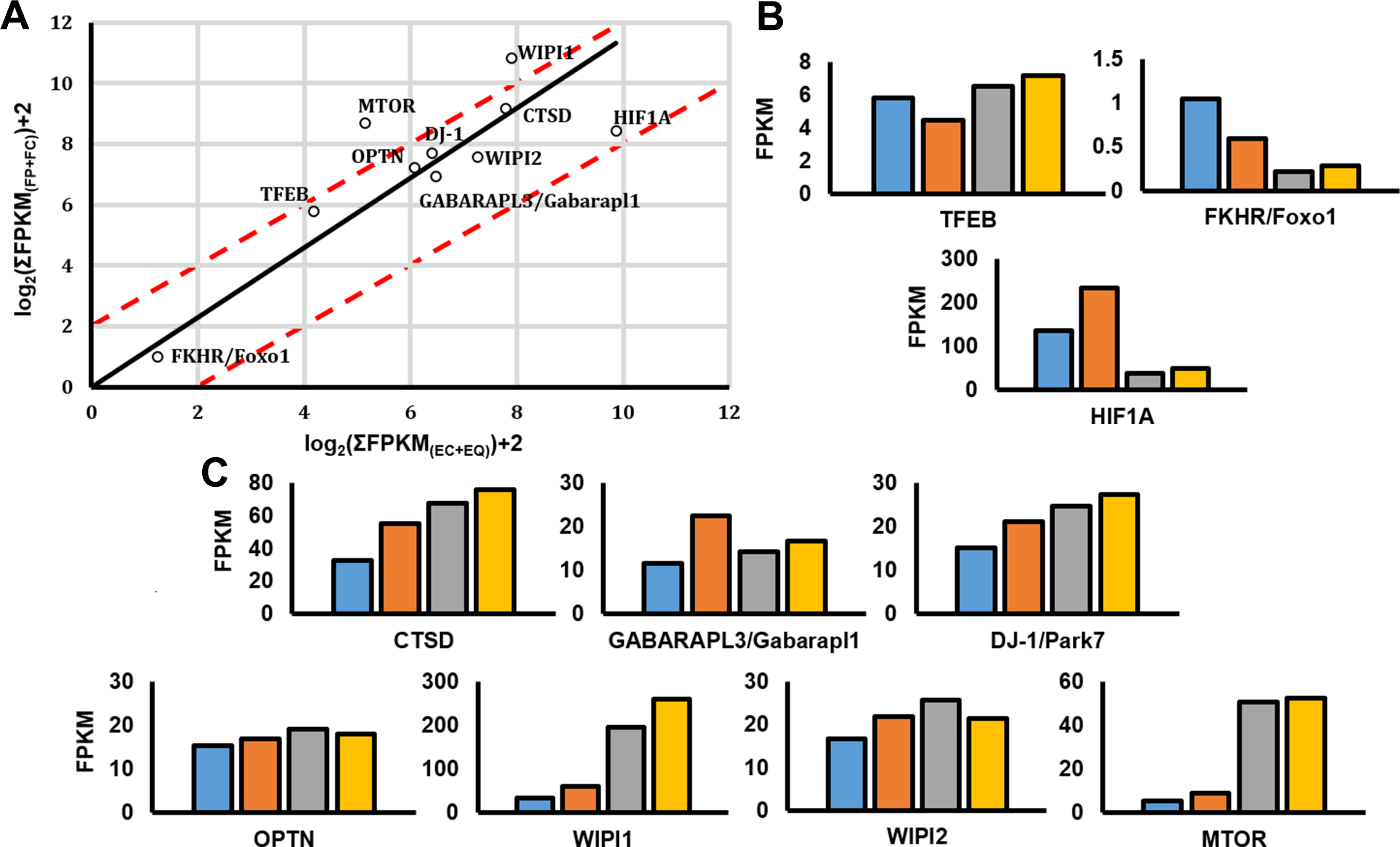 Figure 10. Dynamics of autophagy gene expression in four compartments of E13 embryonic chicken lenses A: Summary of expression data for E13 chicken lenses. B: Tfeb, Foxo1, and Hif1a. C: Ctsd, Gabarapl3 (homolog of Gaparapl1), Park7 (DJ-1), Optn, Wipi1, Wipi2, and Mtor. Central anterior epithelium (blue),