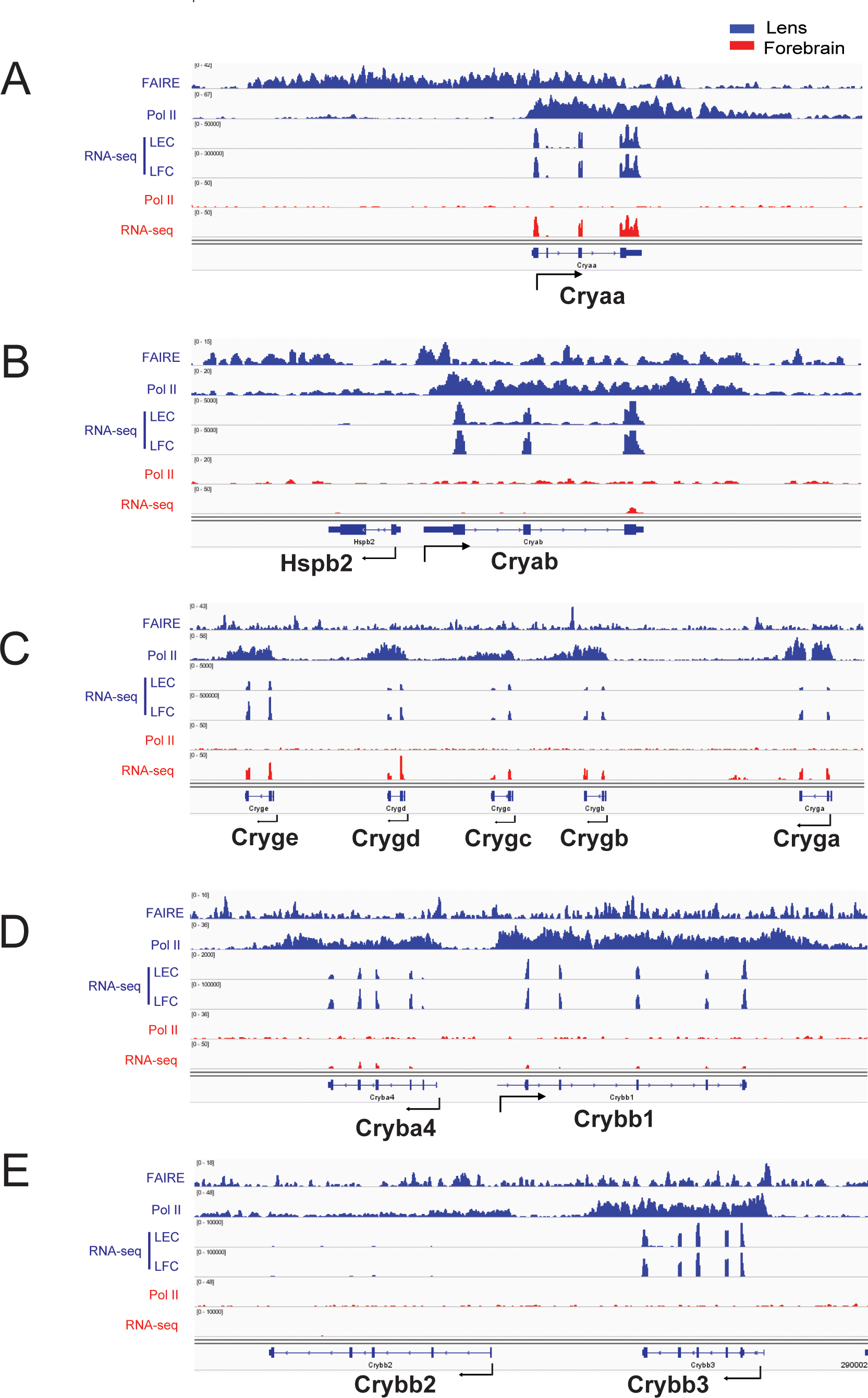 Figure 4. Chromatin structure and RNA visualization of representative mouse crystallin genes. A: Cryaa (chromosome 17, length of region shown: 40 kb). B: Cryab-Hspb2 (chromosome 9, length of region shown: 20 kb). C: A cluster of six γ-crystallin genes and βA2-crystallin (Cryba2) is present on chromosome 1. A 100 kb region encompassing five genes, including Cryga, Crygb, Crygc, Crygd, and Cryge, is shown. D: Cryba4-Crybb1 (chromosome 5, length of region shown: 40 kb). E) Crybb2-Crybb3 (chromosome 5, length of region shown: 40 kb). Tracks: Lens (FAIRE-seq, pol II, RNA-seq), forebrain (pol II and RNA-seq).