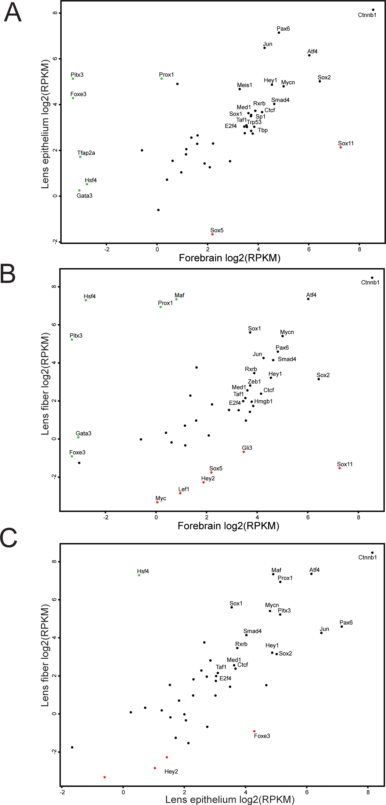 Differential expression of DNA-binding transcription factors that are highly expressed in lens epithelium and lens fibers.