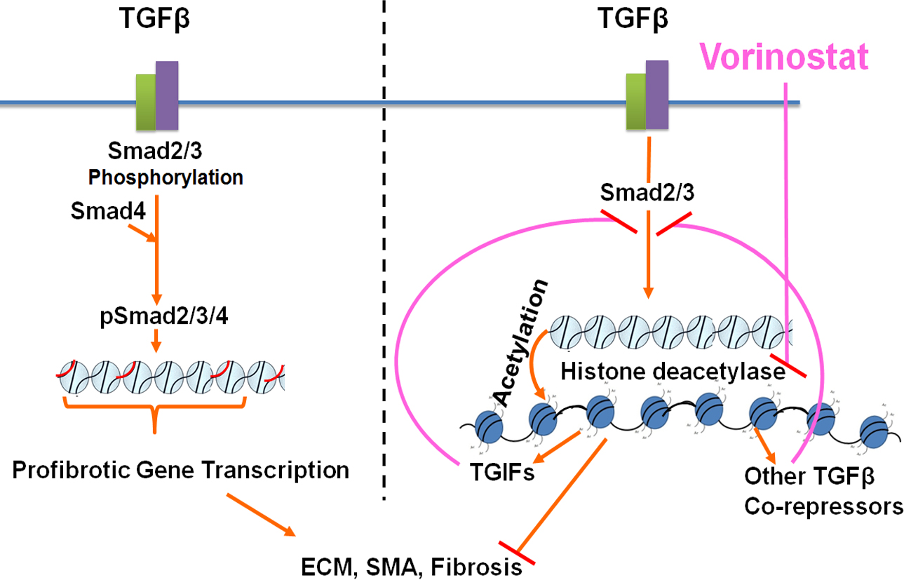 Schematic representation of the role of TGIFs in the antifibrotic effect of vorinostat in the cornea.