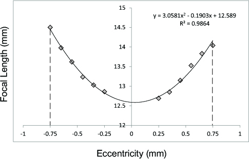 Figure 2. Effects of disruptors on lenticular optics. Line graph showing the focal length (mm) at various eccentricities (mm) of a typical