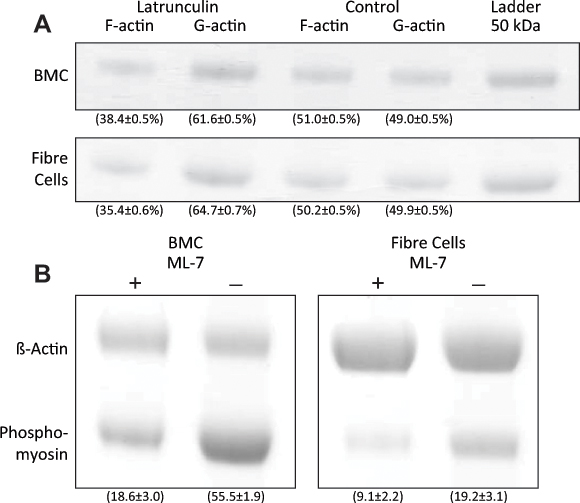 the mean percentage optical density (±SEM) relative to the total amount of actin. (B) Western blots of phospho-myosin in BMC and lens fiber cell samples treated with ML-7. Numbers in parentheses represent the