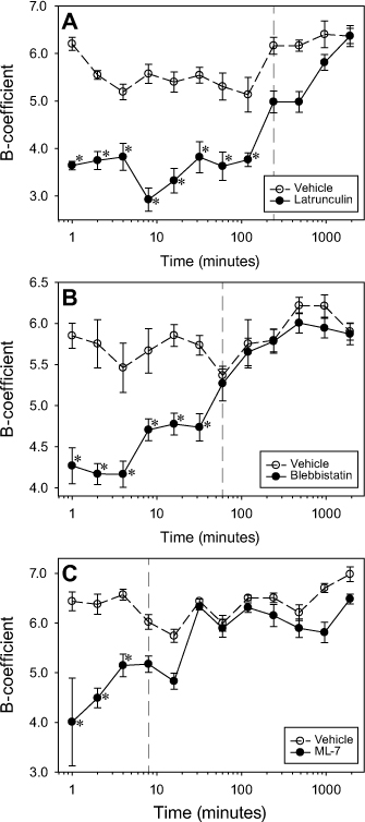 Figure 7. Time course of lenticular stiffness following disruptor removal. Longitudinal recovery effects of (A) 10 µM latrunculin (n = 6), (B) 10 µM blebbistatin (n = 6), and (C) 10 µM ML-7 (n = 6) on lens stiffness compared to vehicle controls. Asterisks (*) indicate significant differences between