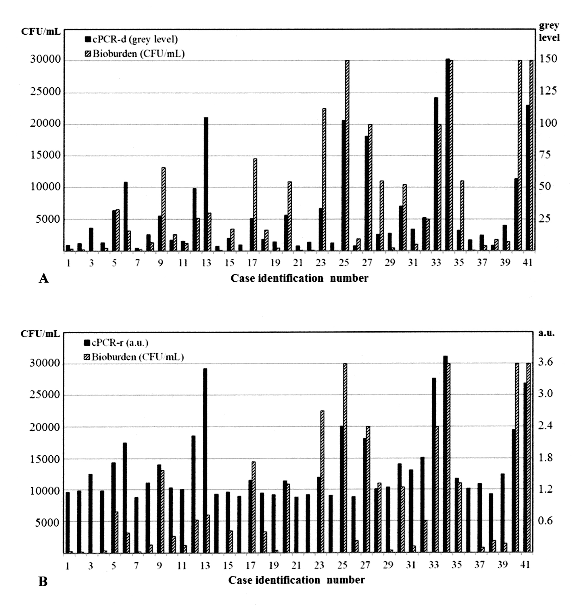 (PCR) analysis for each case. A: Bacterial bioburden versus cPCR-d (the corrected difference in PCR intensity, defined as the difference in the mean intensities