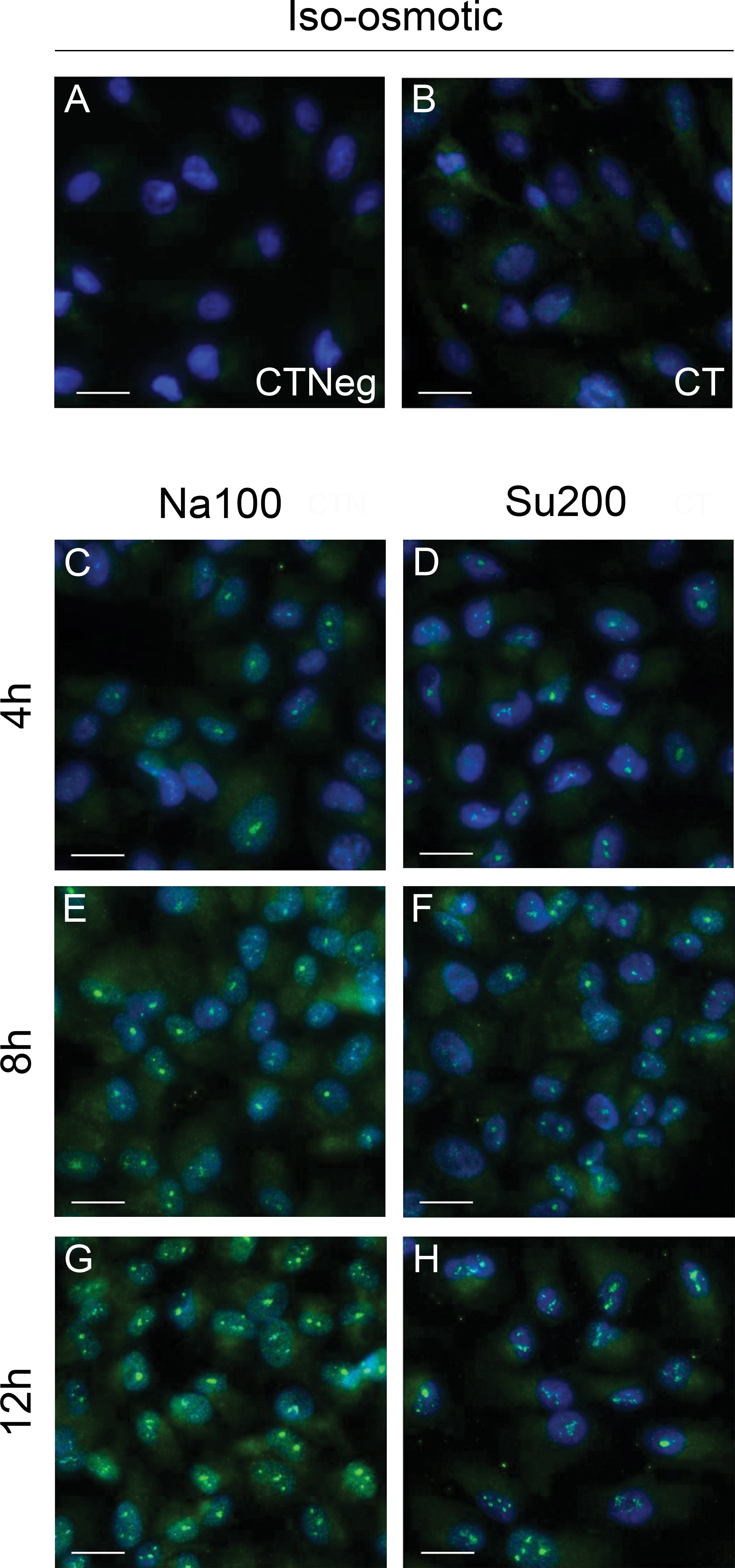 (in green) as described in the Methods section. A: Negative control (CTNeg) was performed in the sole presence of secondary antibodies. B: Cells were incubated under iso-osmolar conditions for 0 h (CT). C, E, G: Cells were incubated with Na100. D, F, H: Cells were incubated with Su200. Cell nuclei were stained with 4’,6-diamidino-2-phenylindole (DAPI; blue). Scale bars represent