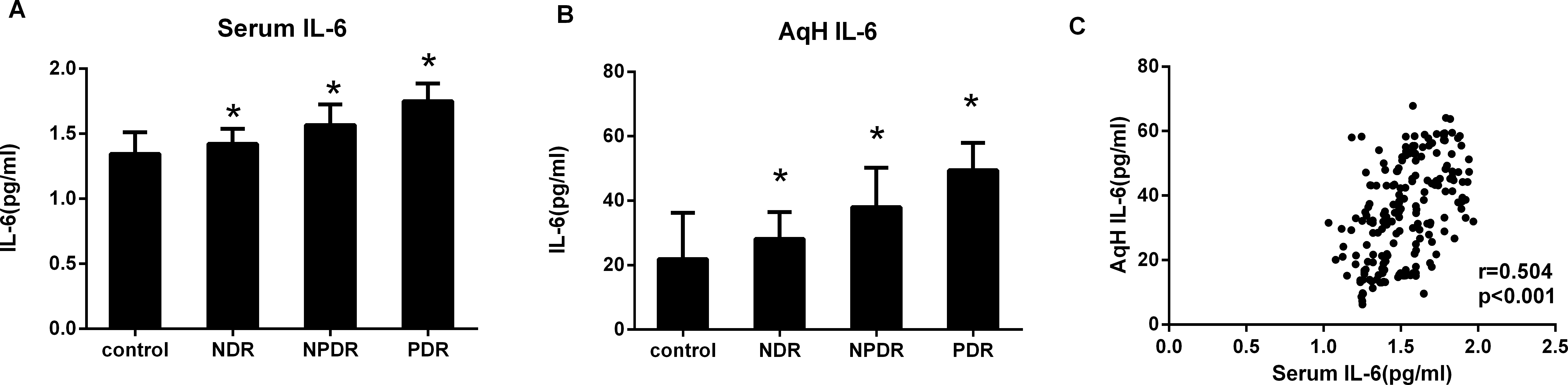multiple comparison test. C: The relationship between IL-6 in AqH and serum was tested, when matched samples were available, with the Spearman correlation.