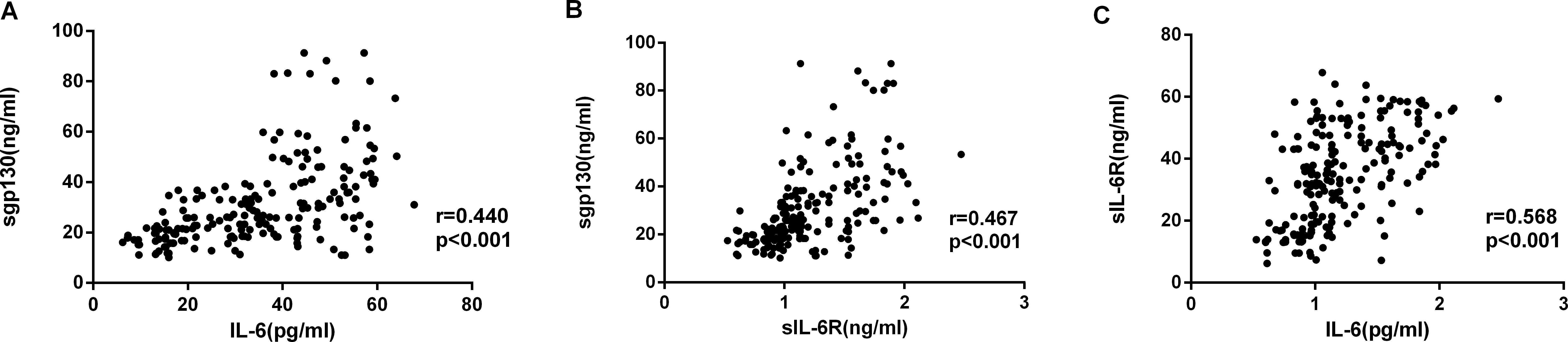 multiplex bead-based immunoassay. A: Relationships between interleukin (IL)-6 and soluble gp130 (sgp130) are shown. B: Relationships between IL-6 and soluble IL-6R (sIL-6R) are shown. C: Relationships between sIL-6R and sgp130 are shown. Data were analyzed by using a Spearman’s rank correlation test.