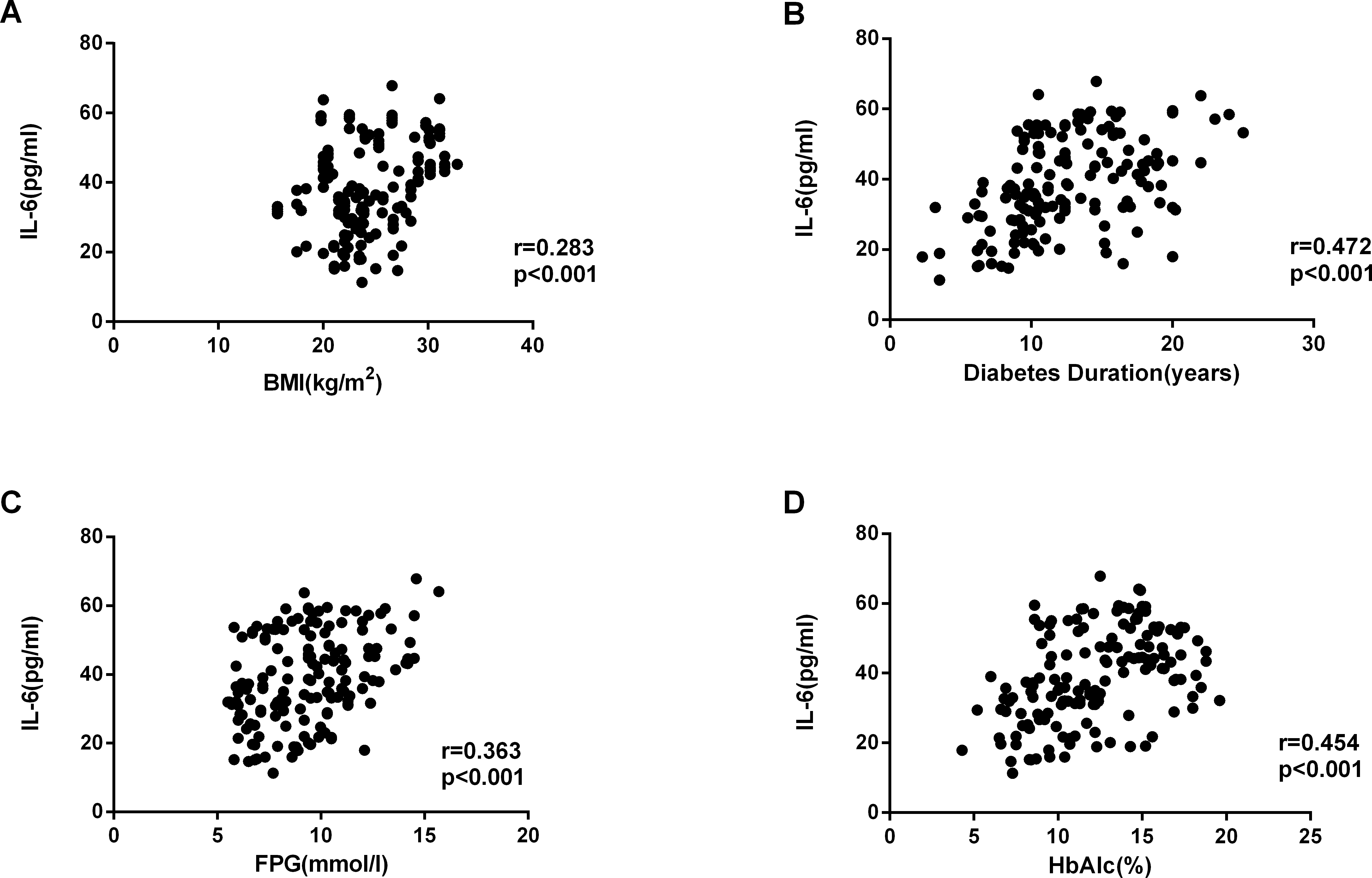 duration of diabetes (r = 0.472, p<0.001), FPG (r = 0.363, p<0.001), and HbA1c (r = 0.454, p<0.001) in patients with T2DM.