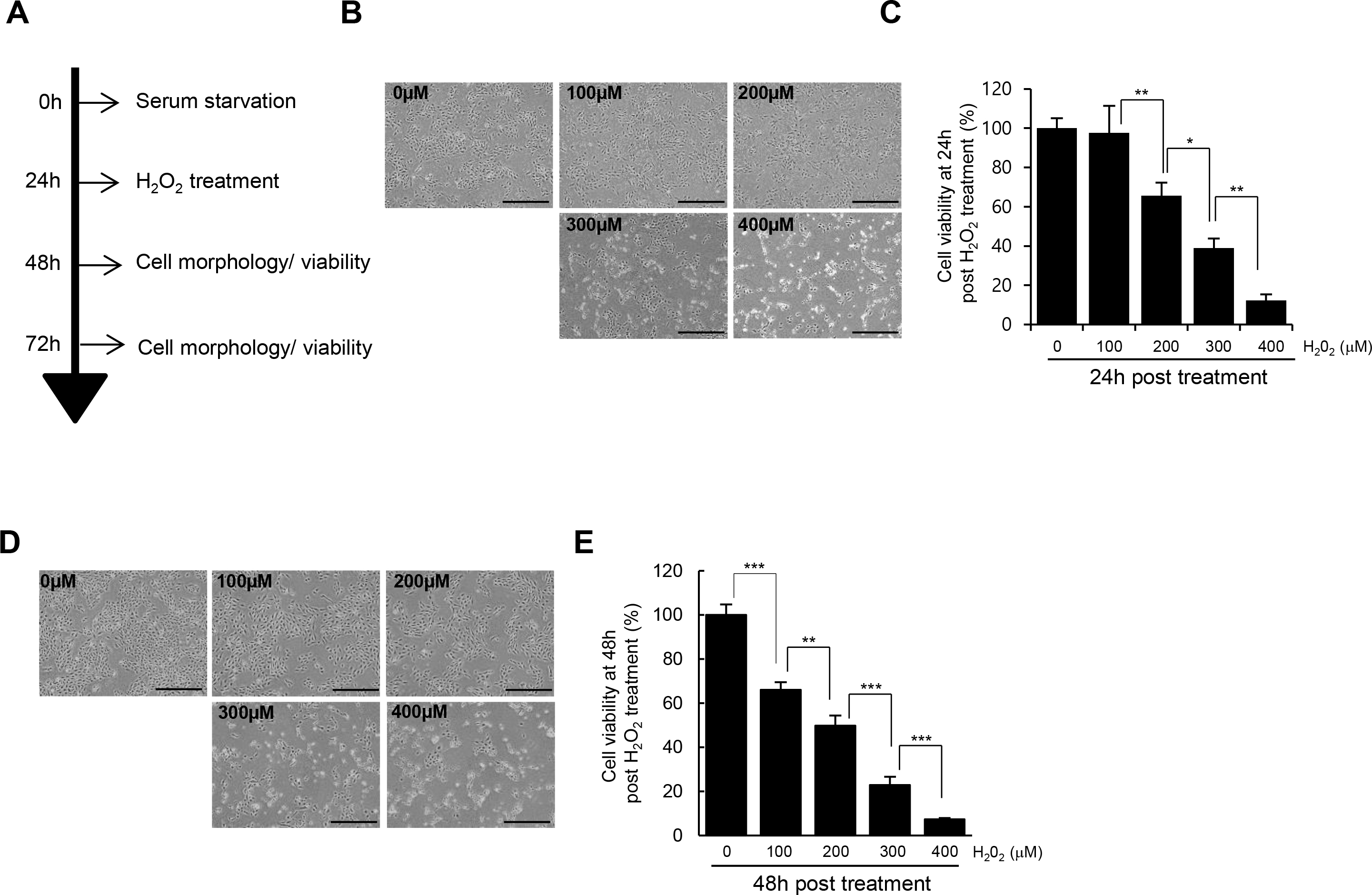 control group. D, E: Cell morphology and viability of RPE cells treated with H2O2 for 48 h. Scale bar: 50 μm. P values of less than 0.05 were considered statistically significant (*p<0.05, **p<0.01, ***p<0.001).