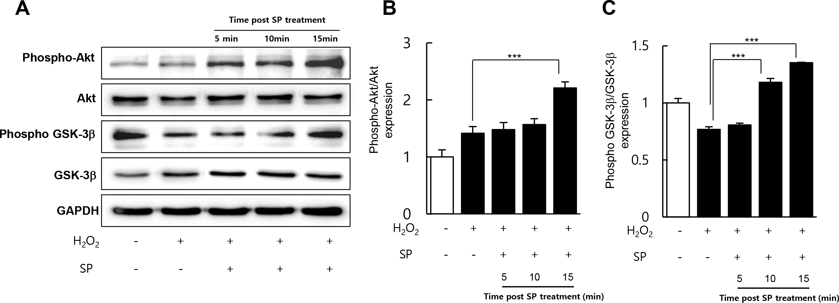 Figure 4. SP activates the Akt/GSK-3β signaling in RPE cells under oxidative stress. RPE cells were treated with 200 μm H2O2 for 24 h, and substance P (SP) was added for 5, 10, and 15 min. A: The levels of phospho-Akt and phospho-glycogen synthase kinase (GSK)-3β were detected with western blotting. B, C: Phospho-Akt and phospho-GSK-3β protein expression levels, relative to the total Akt and GSK-3β, were quantified using the