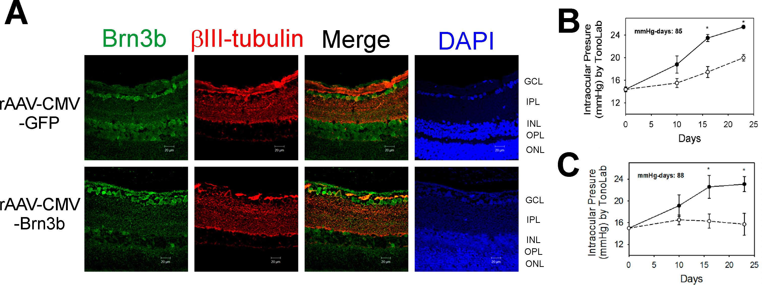 followed by intravitreal injection with either rAAV-CMV-GFP or rAAV-CMV-Brn3b. IOP values were plotted as mean ± standard