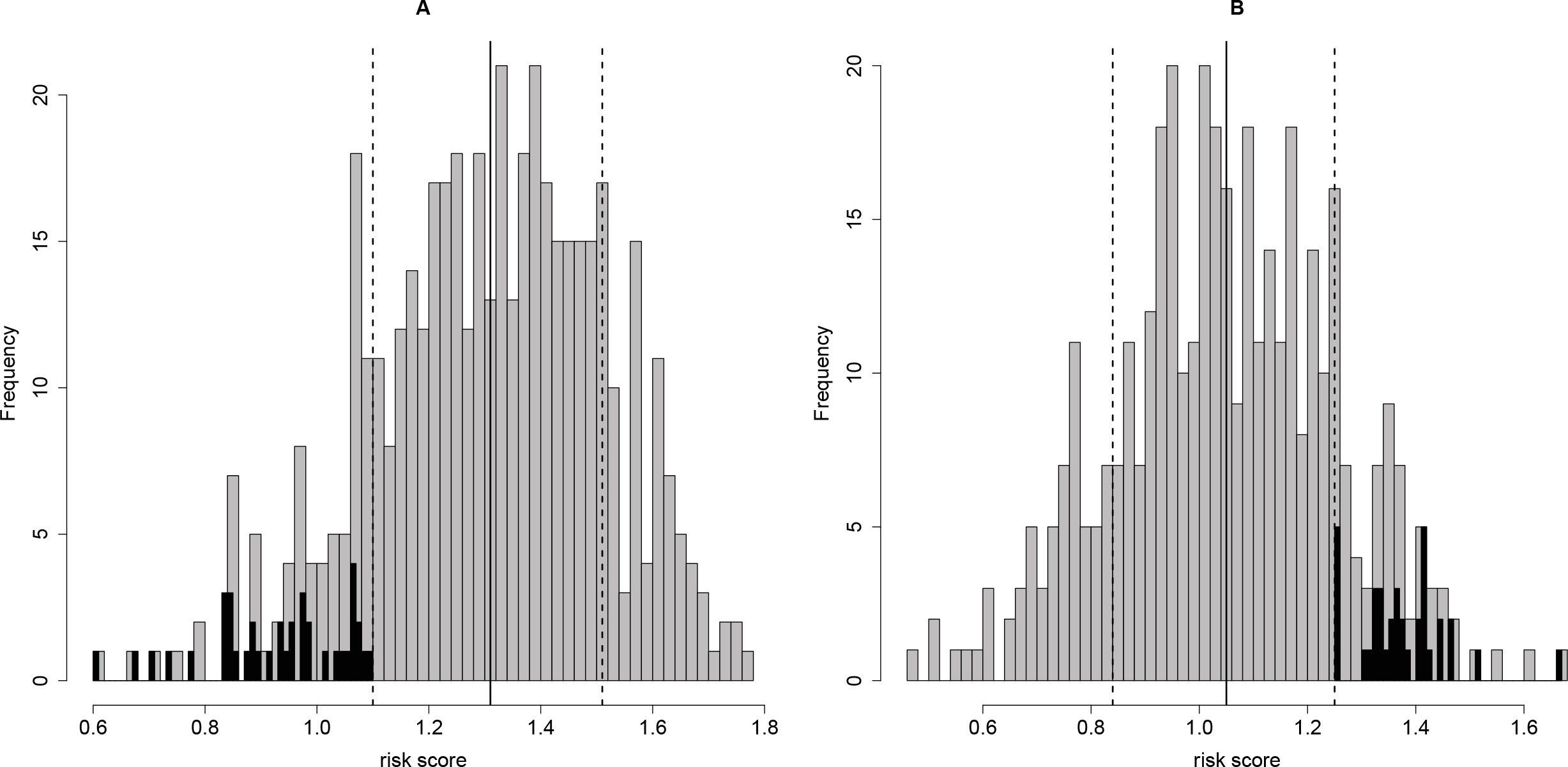 Figure 1. Distribution of risk scores. Distribution of (A) bilateral Grade 5 cases and (B) bilateral Grade 1 controls, showing the mean genetic risk score (solid line) and ±1 standard deviation (dashed lines). Sequenced