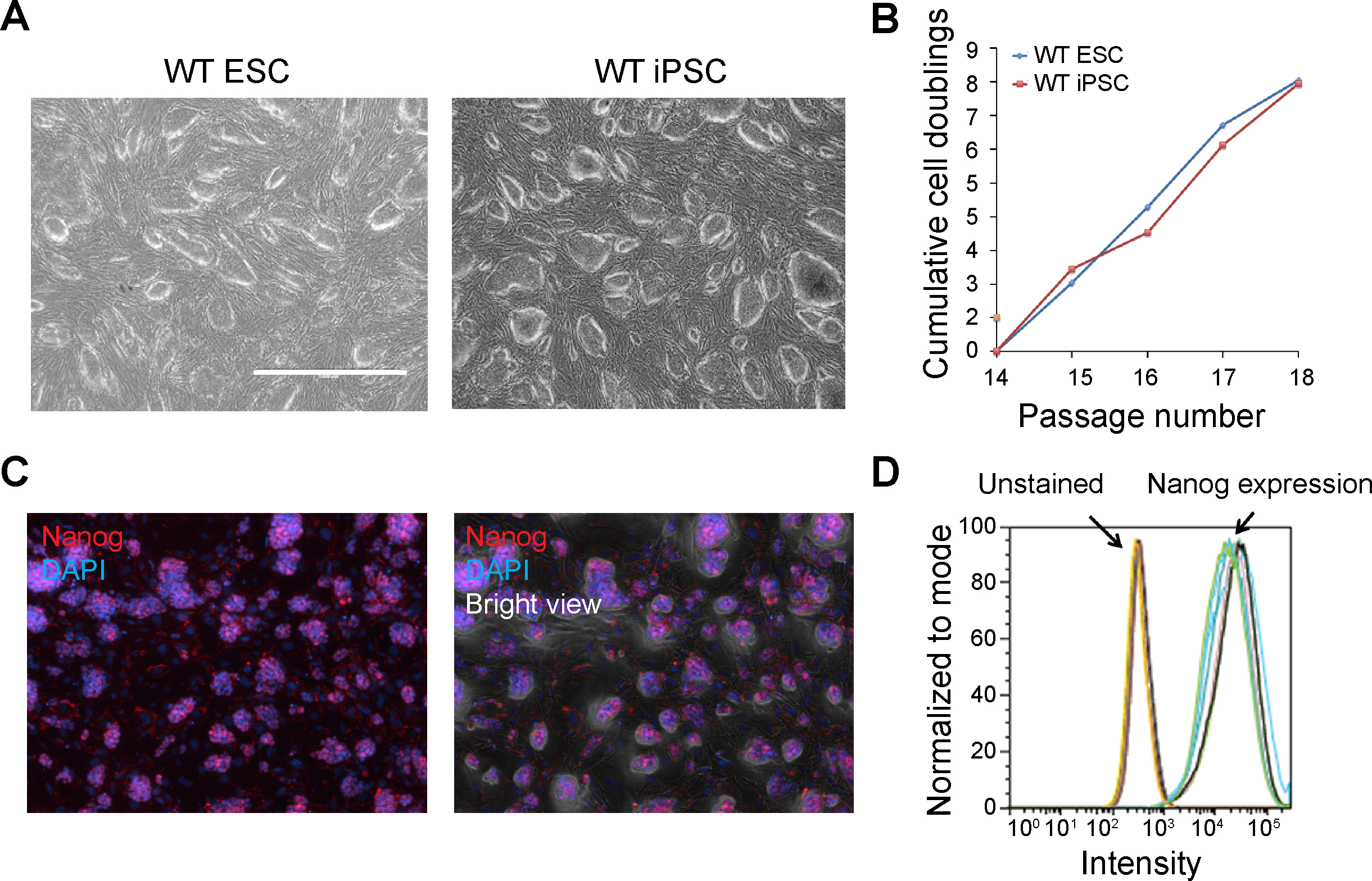 Figure 1. Characterization of mouse ESCs and iPSCs. (A) morphology, (B) proliferation rate, (C) expression of pluripotency marker Nanog, and (D) percentage of Nanog+ cells. No significant morphological differences were observed between the embryonic pluripotent stem