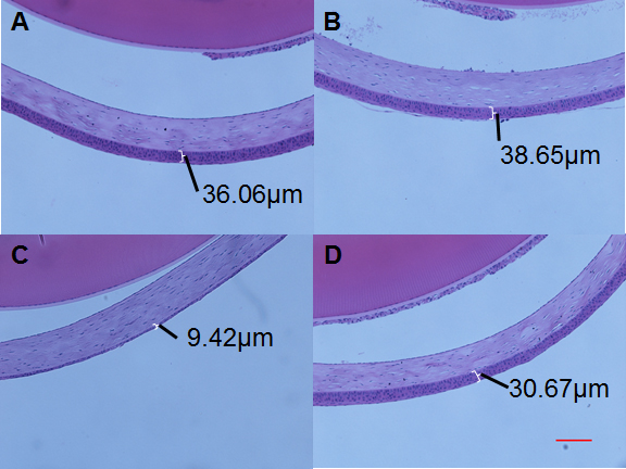Figure 3. Corneal thickness after therapy. Whole eye tissue sections were stained with hematoxylin and eosin (H&E) to measure the corneal