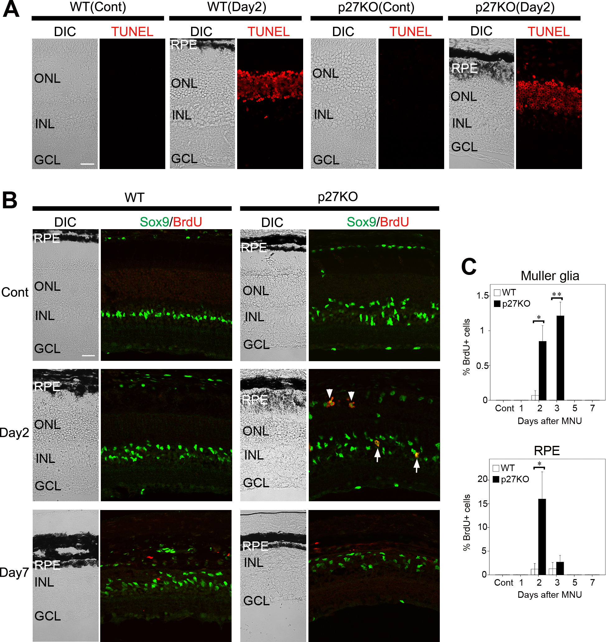Figure 1. Proliferation of Müller glia and RPE cells in the WT and p27 KO retinas after MNU-induced photoreceptor damage. A: Terminal deoxynucleotidyl transferase dUTP nick end labeling (TUNEL) assays. In the wild-type (WT) and knockout (KO) retinas,