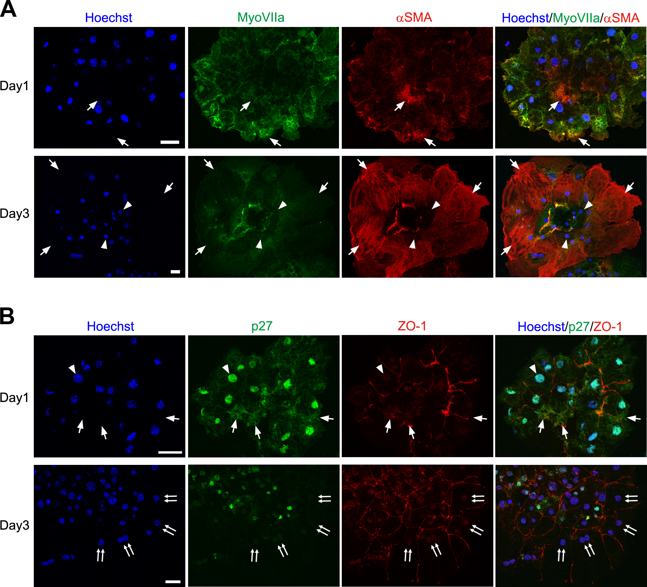 1 while nuclear and cytoplasmic p27 is lost in many RPE cells by day 3 (double arrows). Hoechst, nuclear staining with Hoechst