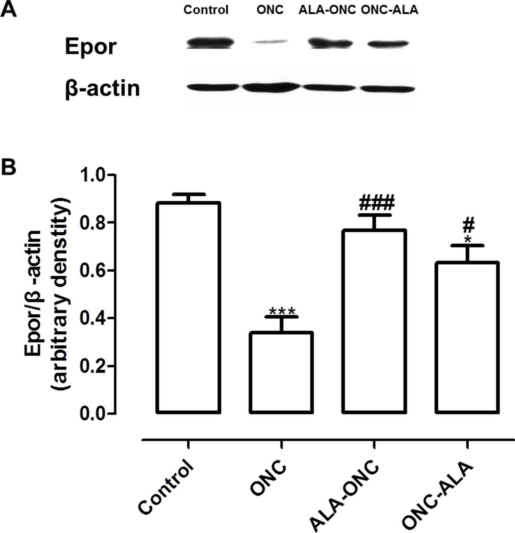 1 day before ONC; ONC-ALA = ALA-treated animal 1 day after ONC. * p<0.05, *** p<0.001 compared to the control group, # p<0.05,