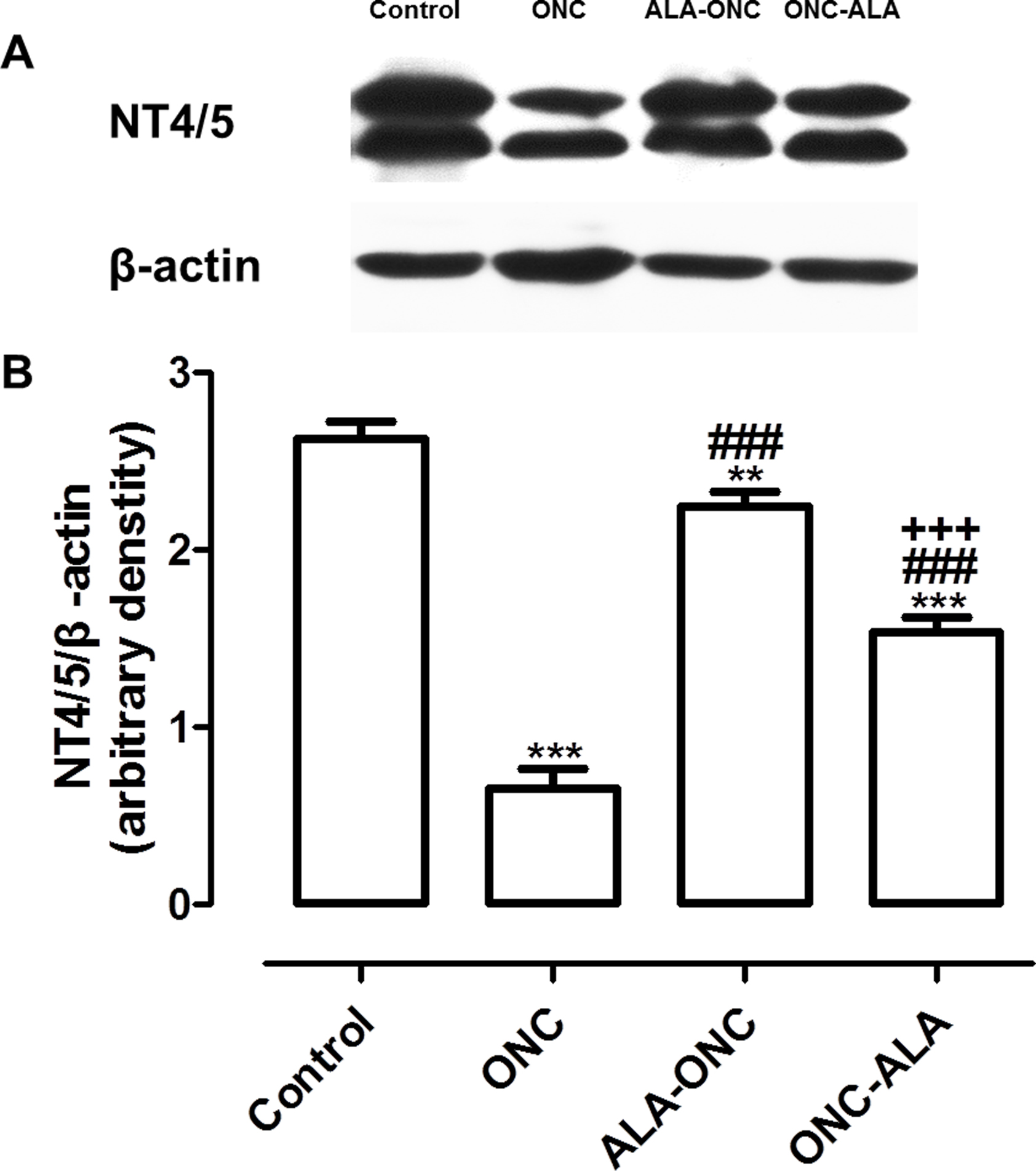 ### p<0.001 compared to the ONC group, +++ p<0.001 compared to the ALA-ONC group at the same time point.