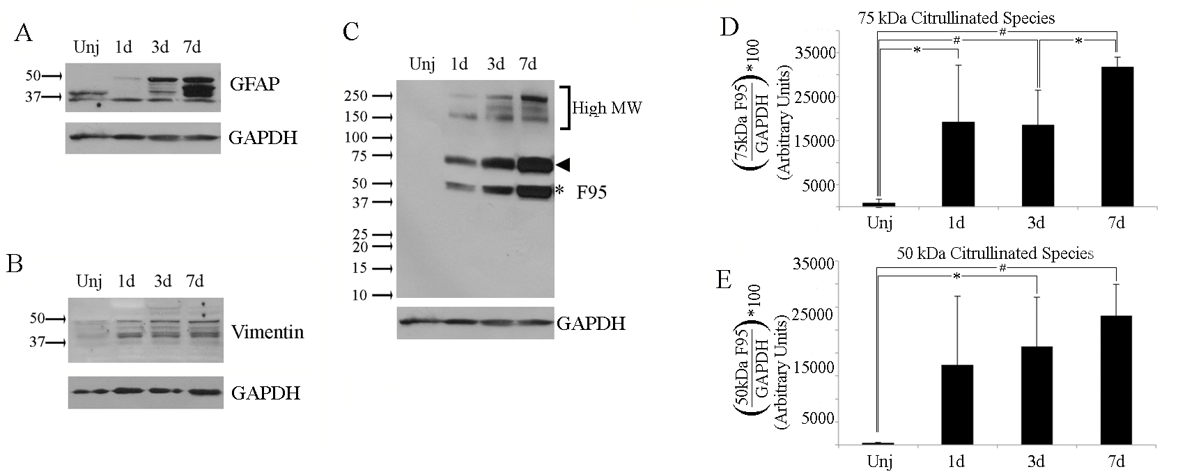 postinjury when examined for citrullination. GFAP antibody reactive species were detected between 37 kDa and 50 kDa (A). Uninjured and injured eyes exhibit vimentin reactivity at isoforms ranging from 37 to 55 kDa (B). D, E: Bar graphs represent quantification of the 75- and 50-kDa citrullinated species. Each sample contained tissue extracts pooled