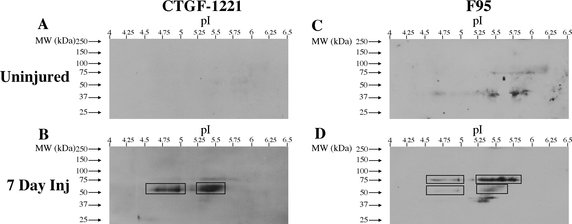 (F95 antibody) and western blotted. A, B: CTGF-1221 antibody was employed first for antigen detection. C, D: F95 antibody was subsequently employed for antigen detection after removal of CTGF-1221 antibody probe. Blots of the injured