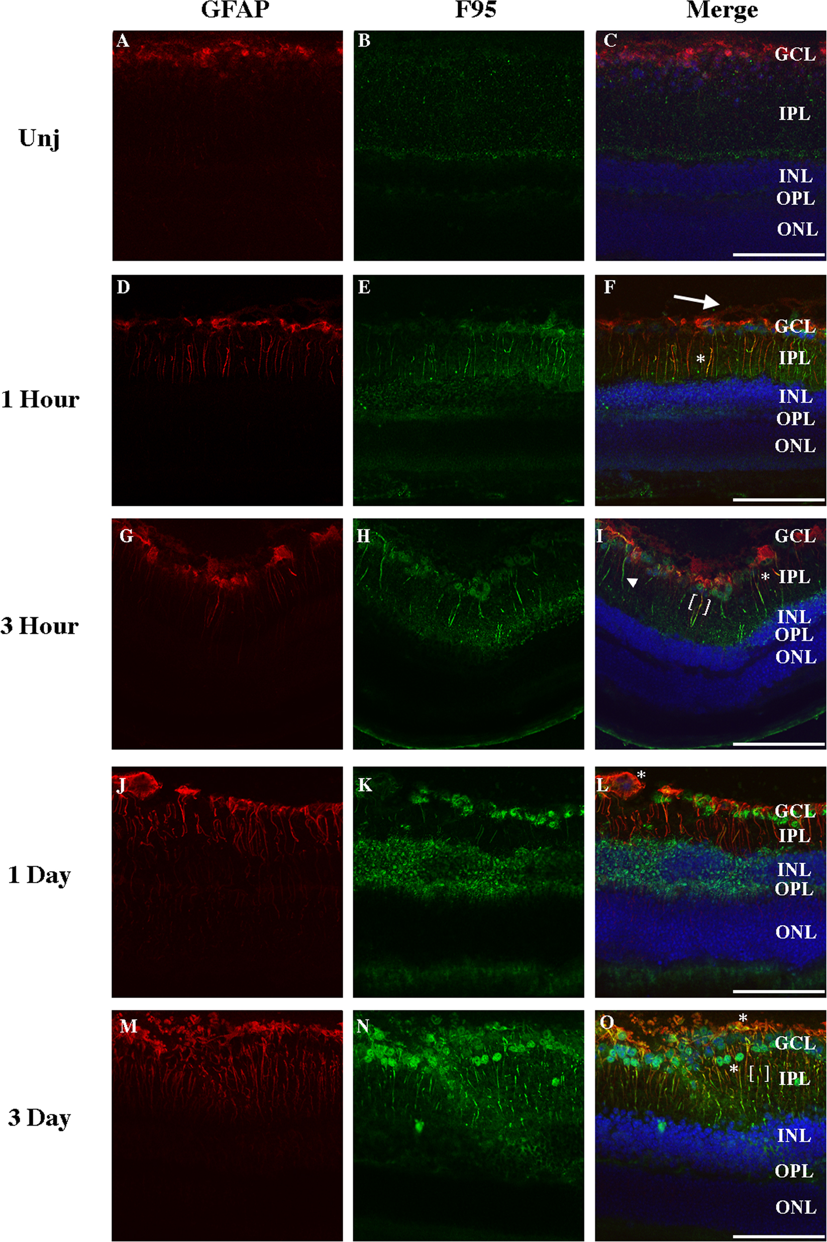 an uninjured state (A-C) and at 1 h (D-F), 3 h (G-I), 1 day (J-L) and 3 days (M-O) postinjury. Extensions of GFAP staining beyond nuclei of the GCL are marked by an arrow (F). Co-localization of GFAP and F95 antibodies are marked by asterisks (F, I, L, O). Interspersed regions of GFAP and F95 reactivity is outlined in brackets (I, O). GFAP-negative, F95-positive filaments are marked by arrowhead (I). GCL, ganglion cell layer; IPL, inner plexiform layer; INL, inner nuclear layer; OPL, outer plexiform layer; ONL, outer