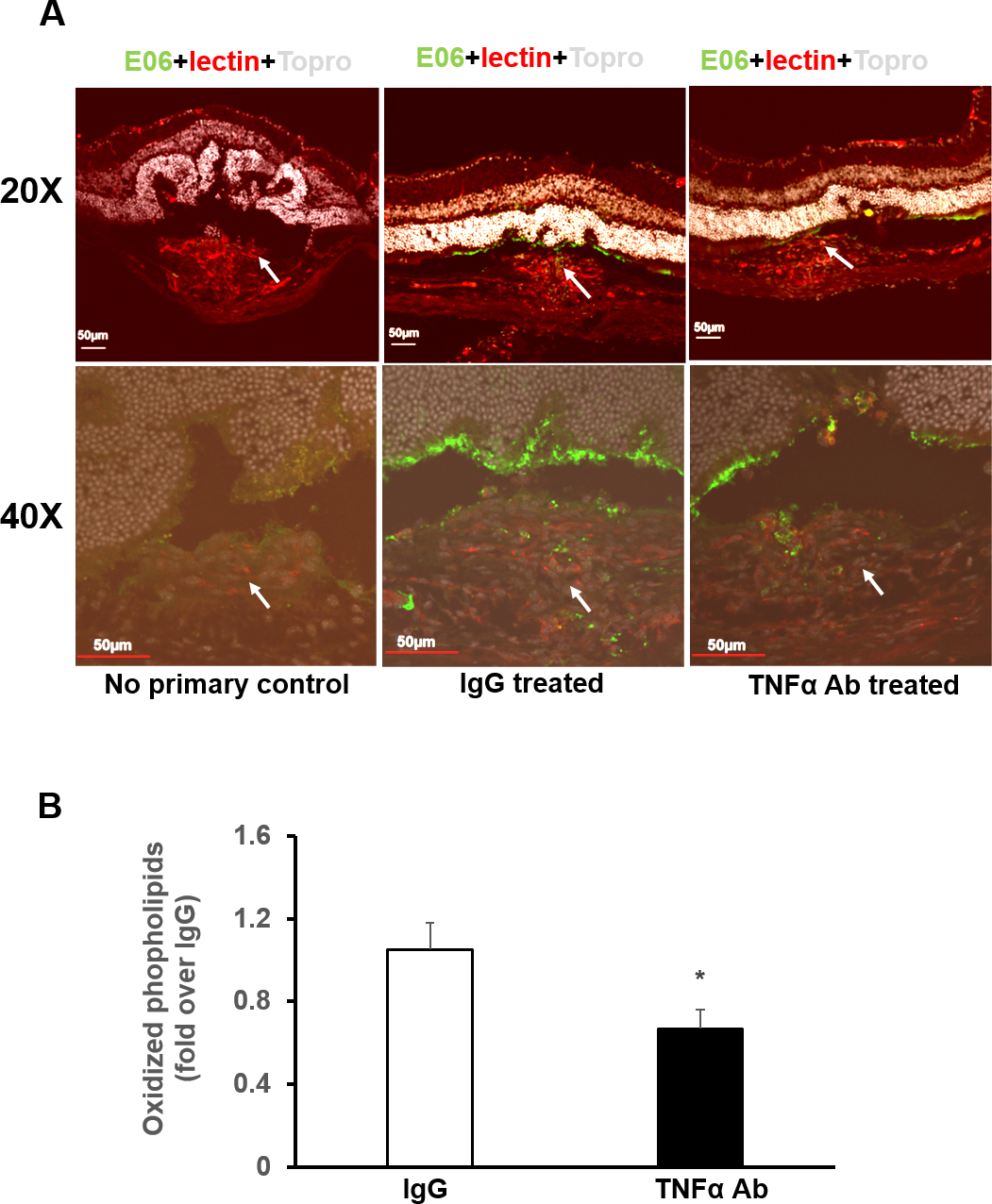 Gray, Topro 3. B: Quantification of densitometry of OxPL immunofluorescence at CNV lesions of mice injected with isotype immunoglobulin G
