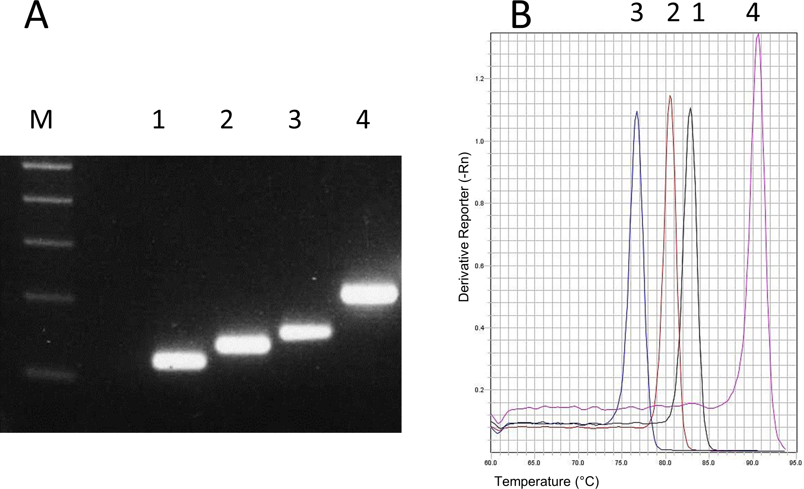 products and insulin and control product (1, 2, 3, 4, respectively). B: Melt curve generated on ABI 7500 Fast of the same products demonstrating the different melting temperatures of the allele-specific
