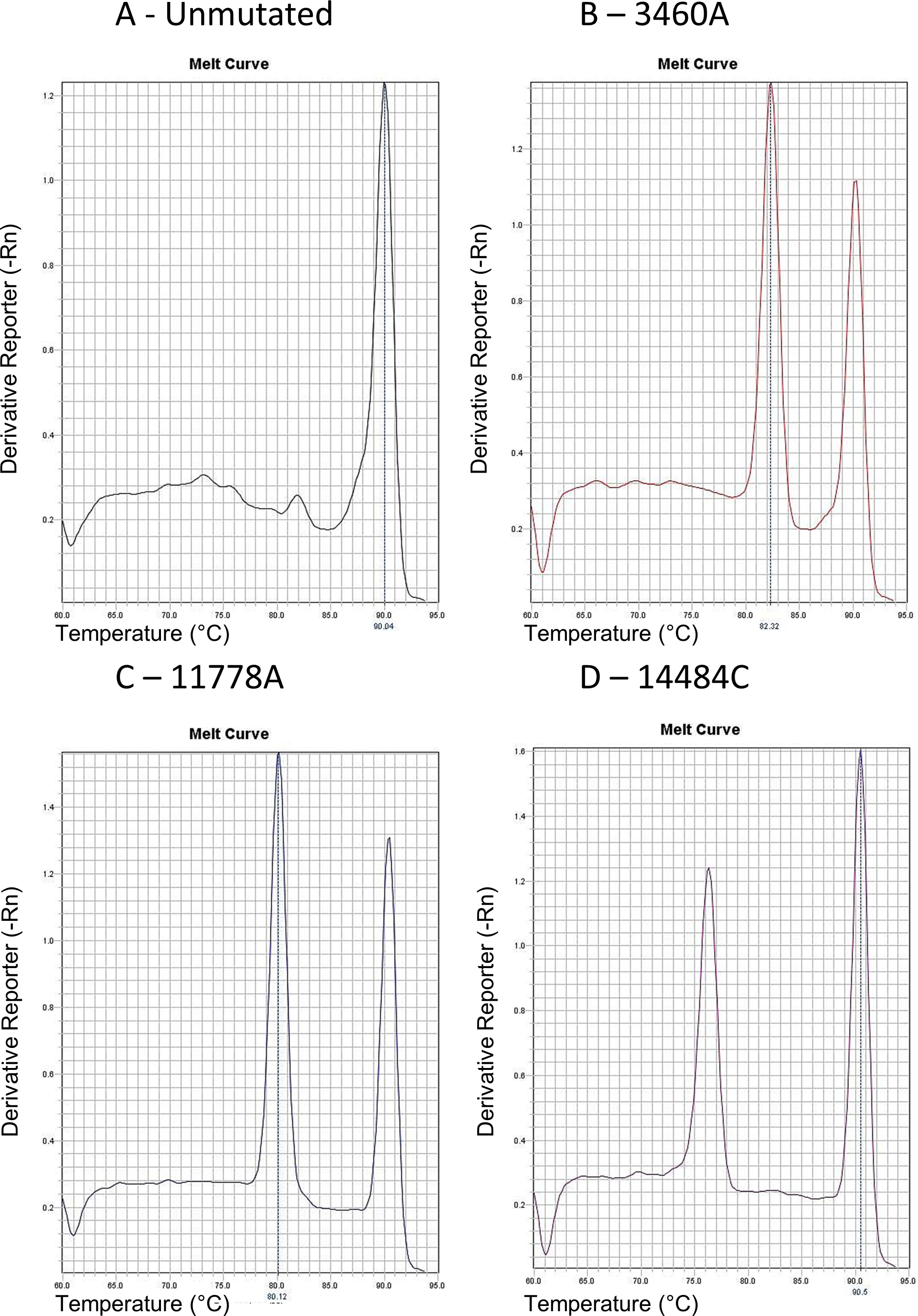Figure 2. Multiplex real-time analysis of LHON subject samples. A: Unmutated DNA; only the control product is amplified. B: Subject DNA with mutation in 3460A; products at 90.04 °C and 82.32 °C. C: Subject DNA with mutation in 11778A; products at 90.04 °C and 80.12 °C. D: Subject DNA with mutation in 14484C mutation; products at 90.04 °C and 76.32 °C.