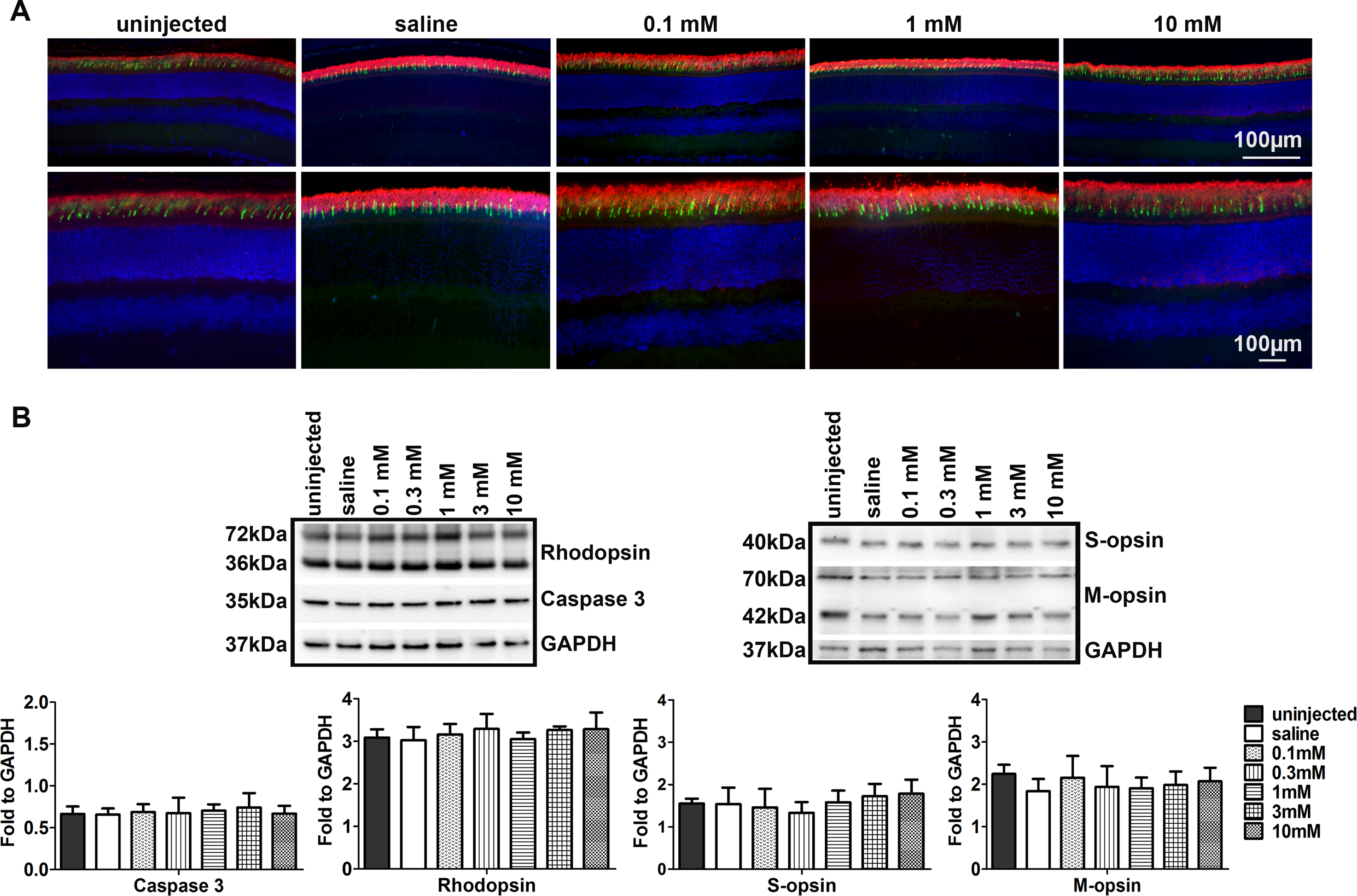 in the outer segments of the retinas. n = 3–6 eyes per group. Scale bar = 100 µm. B: Western blots were performed at PI7 h to assess the protein levels of rhodopsin, M-opsin and S-opsin, and caspase 3. Densitometric