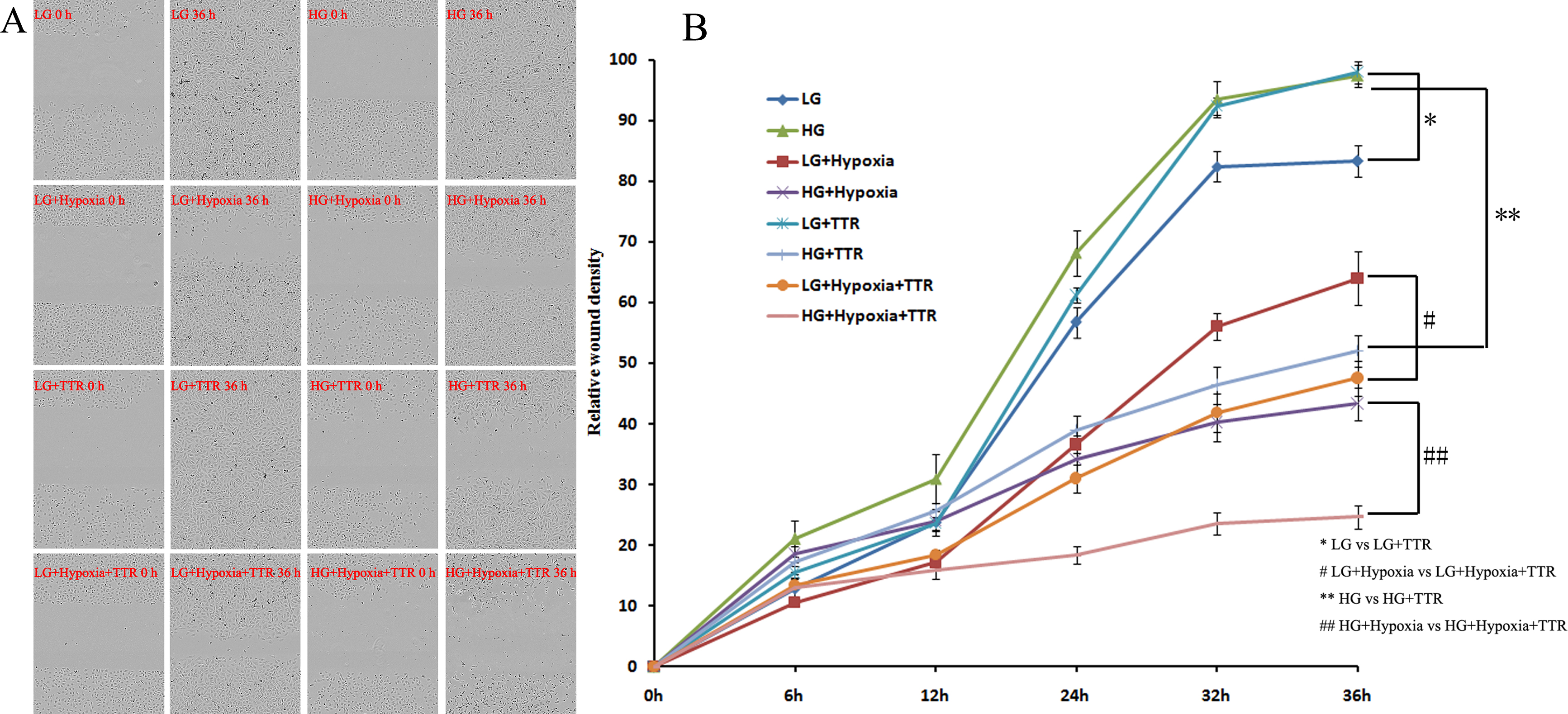 (DR) environments with TTR, and the relative wound density (RWD) was detected to reveal the migration efficiency. B: After the 36-h culture, in the natural environments (LG and LG+TTR), the RWD was slightly promoted by TTR (*: p = 0.002,