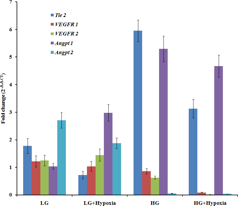 Figure 5. TTR modulated the expression of several genes for NV development in hRECs. In the natural medium (LG) with TTR, the VEGFR1, VEGFR2, Tie2, and Angpt2 levels were all upregulated, while Angpt1 was unchanged. In the LG+Hypoxia medium with TTR, Tie2 and VEGFR1 were downregulated, while VEGFR2, Angpt1, and Angpt2 were all upregulated. In the hyperglycemia (HG) medium with TTR, Tie2 and Angpt1 were significantly upregulated, while Angpt2, VEGFR1, and VEGF2 were dramatically decreased. In the HG+Hypoxia medium with TTR, Tie2 and Angpt1 were upregulated, whereas Angpt2, VEGFR1, and VEGF2, were downregulated.